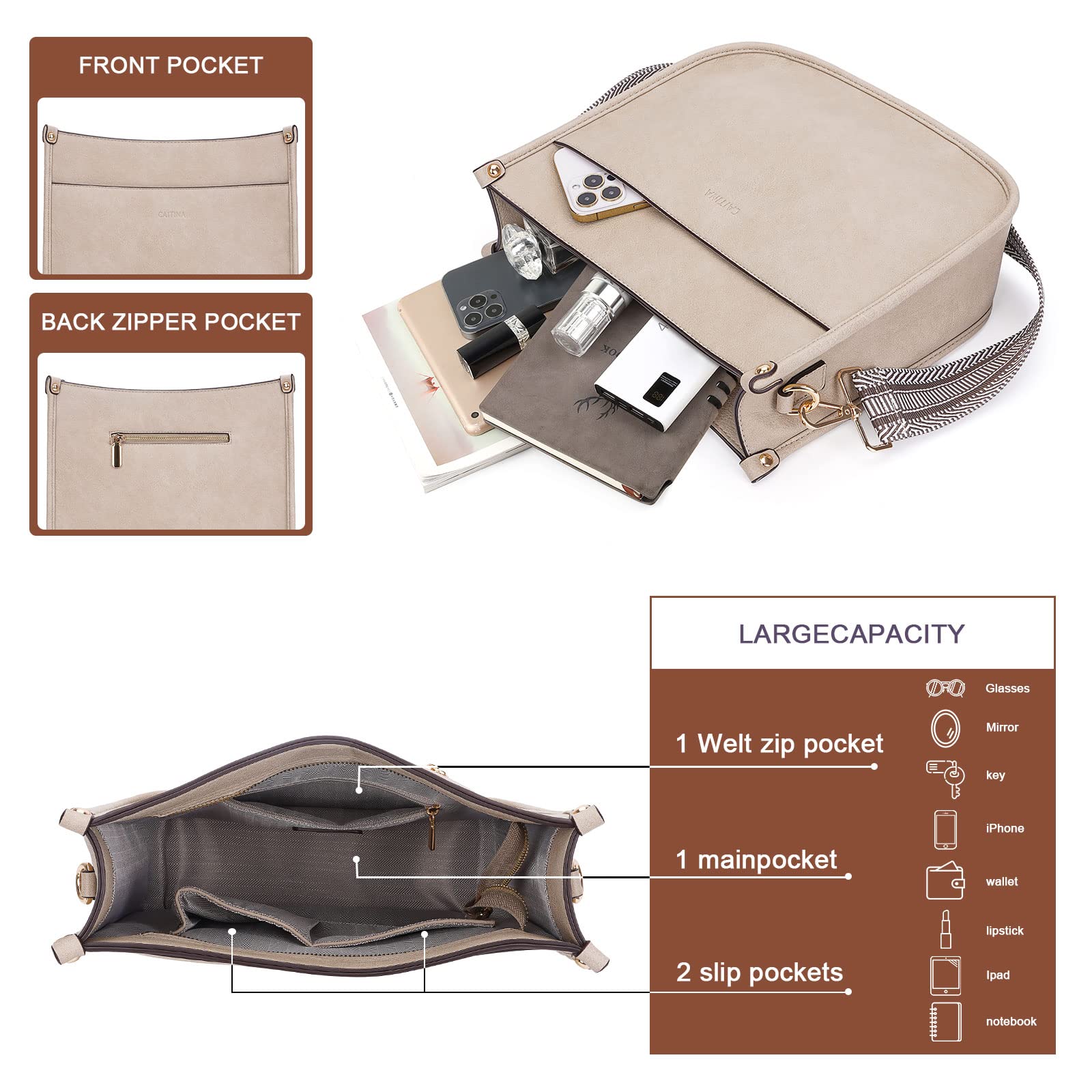 Crossbody Bag Structure:Internal structure is one main compartment including 1 main pocket,1 inner zipper pocket,2 slip pockets-cell phone pocket and ID card slot.External structure including 1 metal magnetic buckle pocket and 1 back anti-theft pockets,come with metal zipper closure,main pocket and back pocket antitheft zipper design-double antitheft to protect your property safety