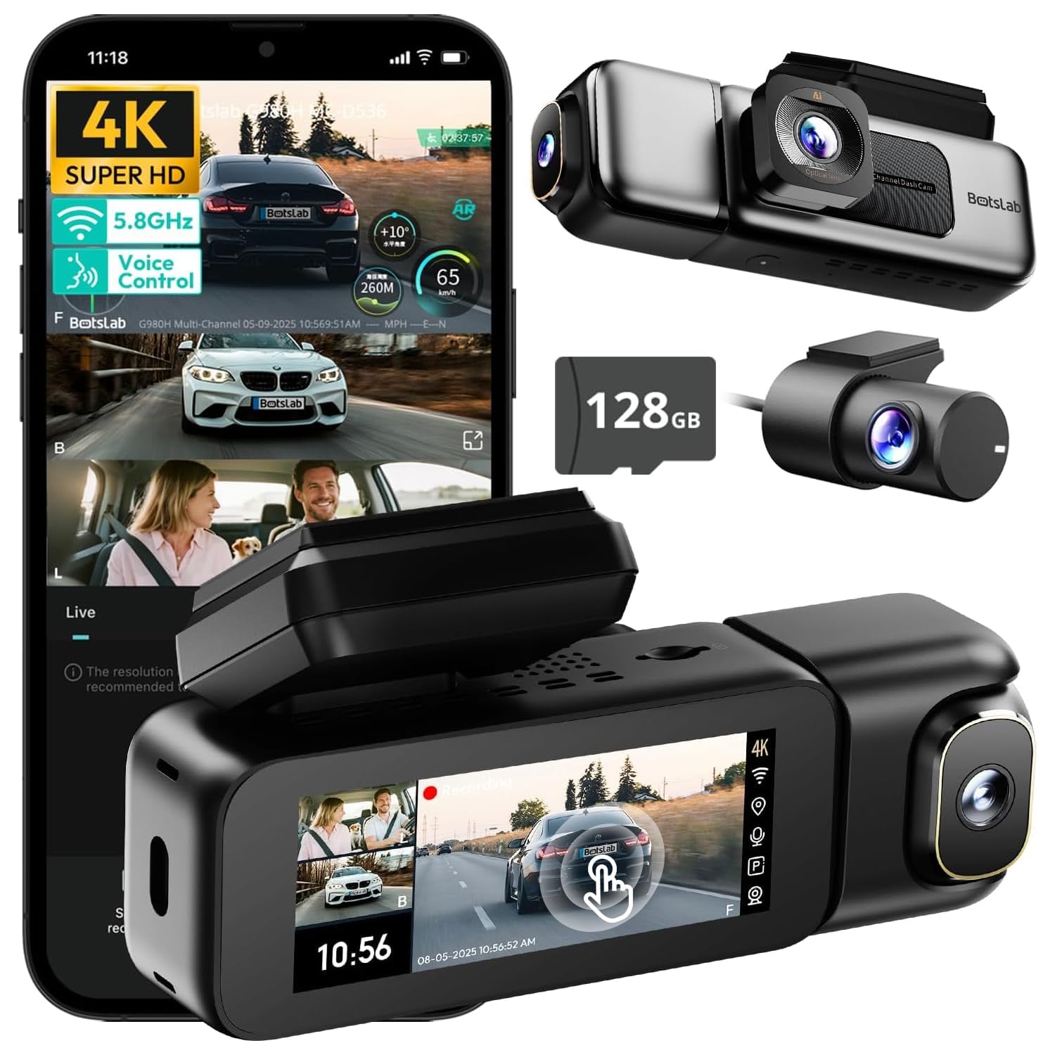 [3.18" Touch Screen & Voice Control] Control recording, shooting, and camera switching via voice commands for safer driving. Features a 3.18" touchscreen for easy settings adjustment. Built-in 5.8GHz WiFi (2.4GHz supported) enables fast transfers. Use the BOTSLAB APP to configure settings, edit clips, download videos, or share moments directly to social media.