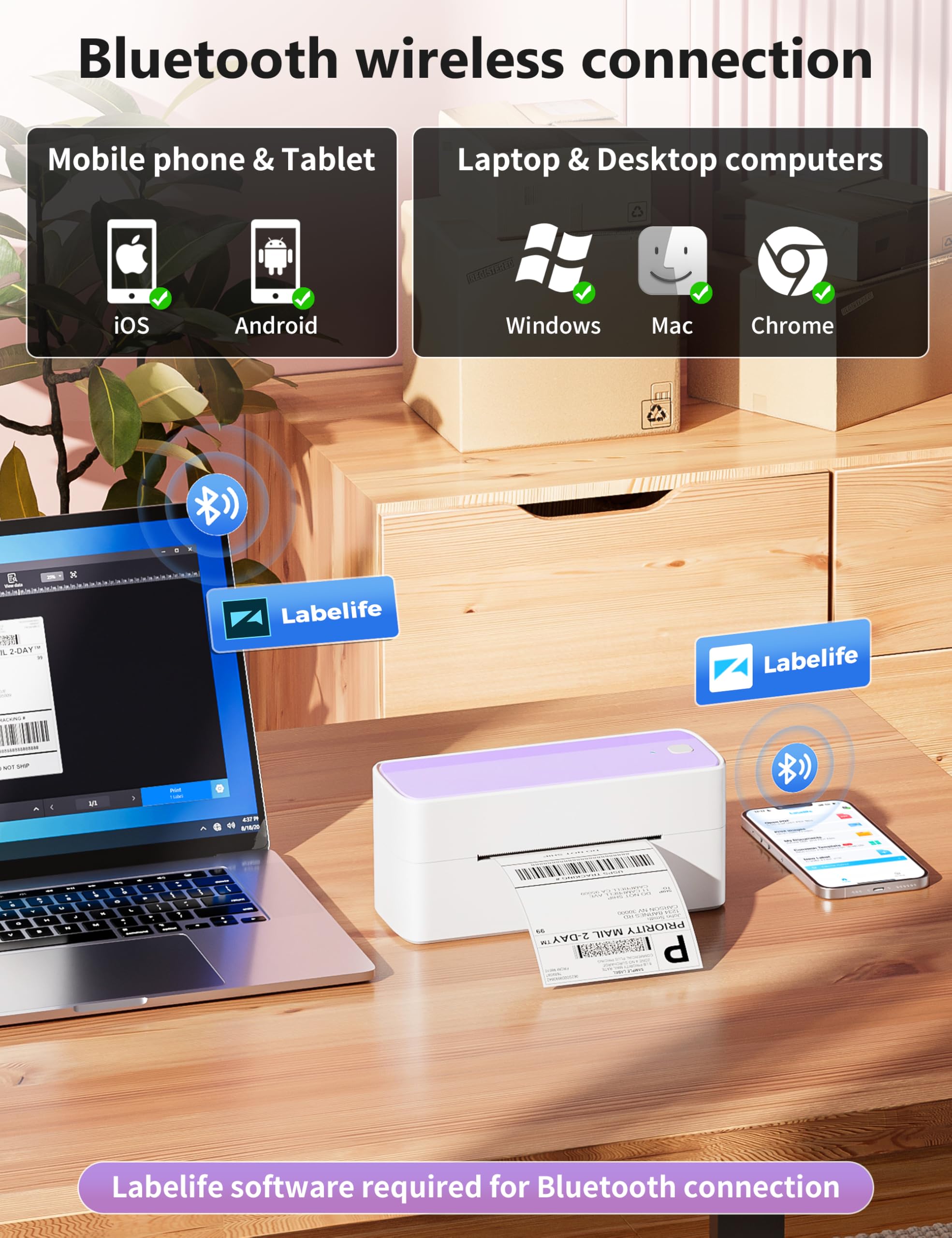 [Print Via Bluetooth] - Phomemo bluetooth shipping label printer supports wireless printing through bluetooth connection. For IOS and Android mobile Phone, need to download the "labelife " APP from Apple Store or Google Play. With easy and simple operations, you can easily print your logo, labels, and more, making your life more convenient! Note: All devices cannot be directly connected to Bluetooth and need to be used through the app