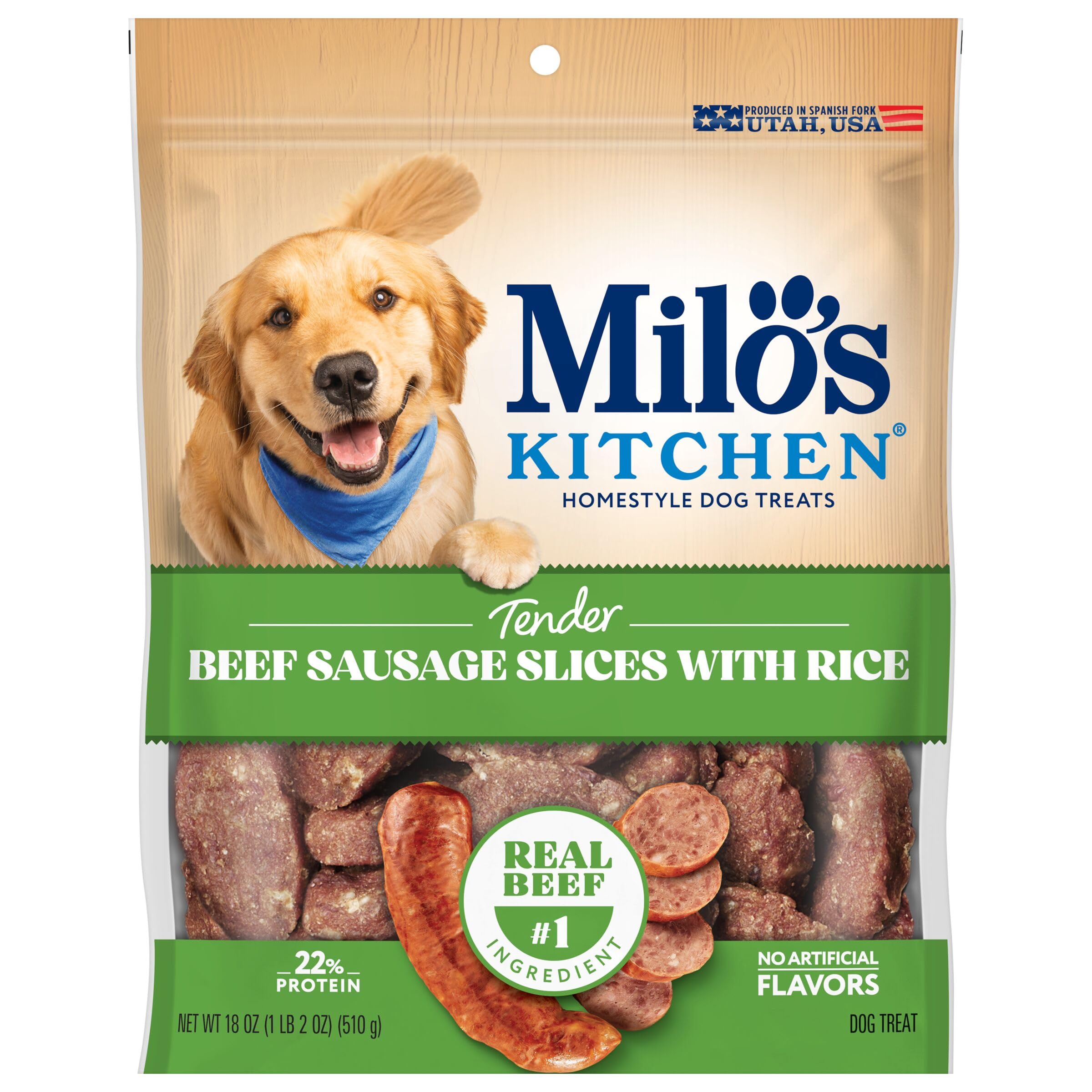 Contains one (1) 18-oz. bag of Milo’s Kitchen Beef Sausage Slices With Rice dog treats