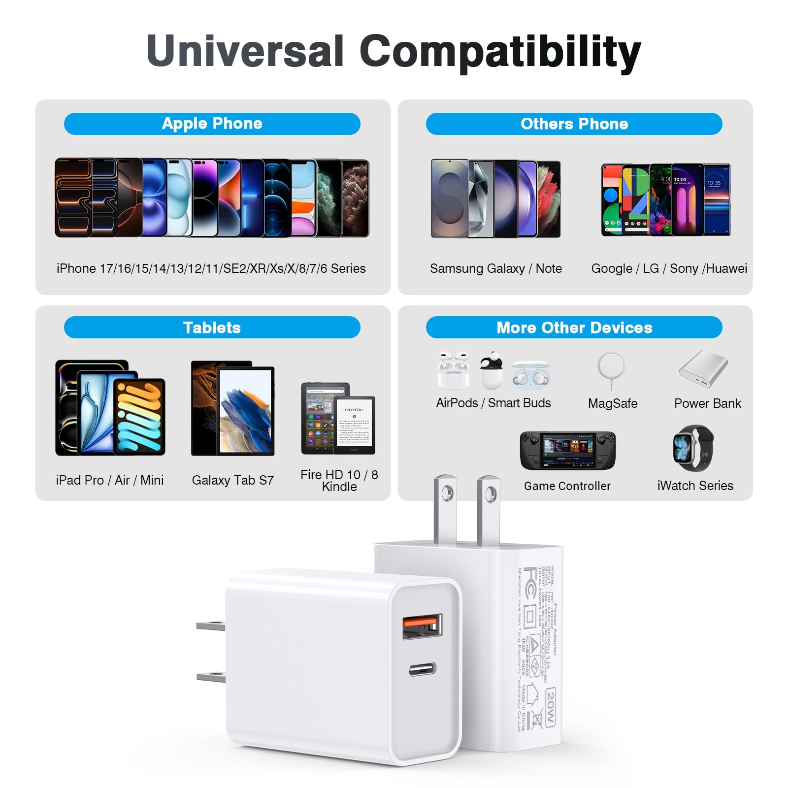 Universal Compatation: Designed for iPhone 17/16/15/14/13/12/11 Pro/ Pro Max. The USB charging adapter is compatible with iPhone, iPad, iPod, smartphone, MP3 / MP4 players, play equipment, GPS devices, PC tablet, Google Nexus Tablet, Samsung Galaxy Tab and other digital devices compatible