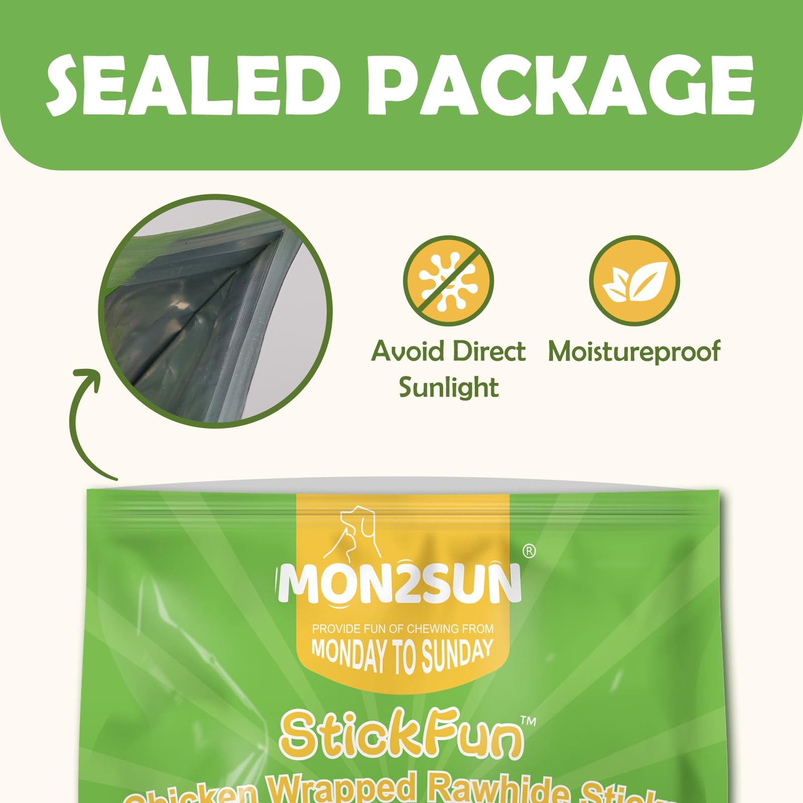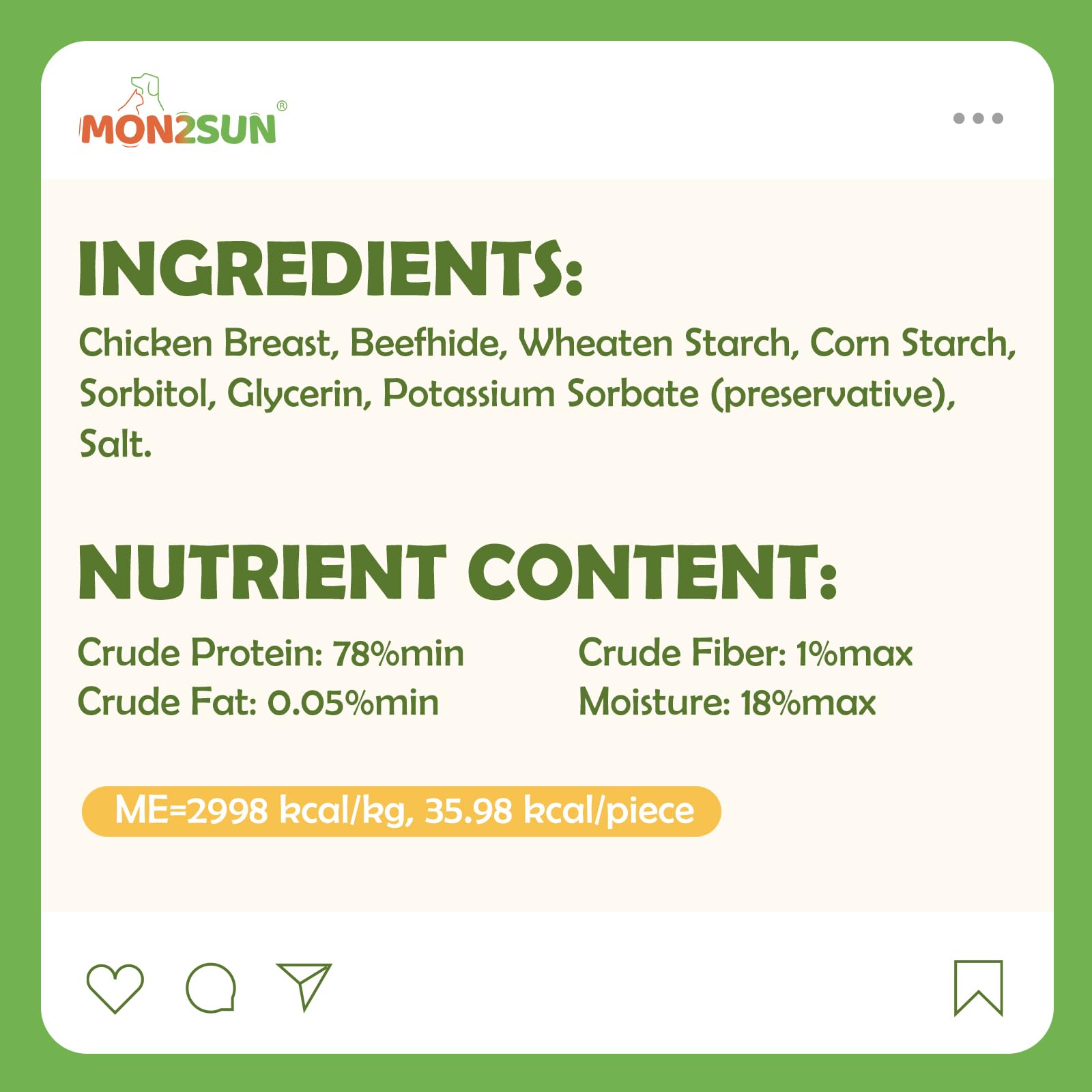 [Natural and High Protein] The chicken rawhides are made with real chicken breast wrapped around a rawhide stick. The rawhides are of high protein, low fat.