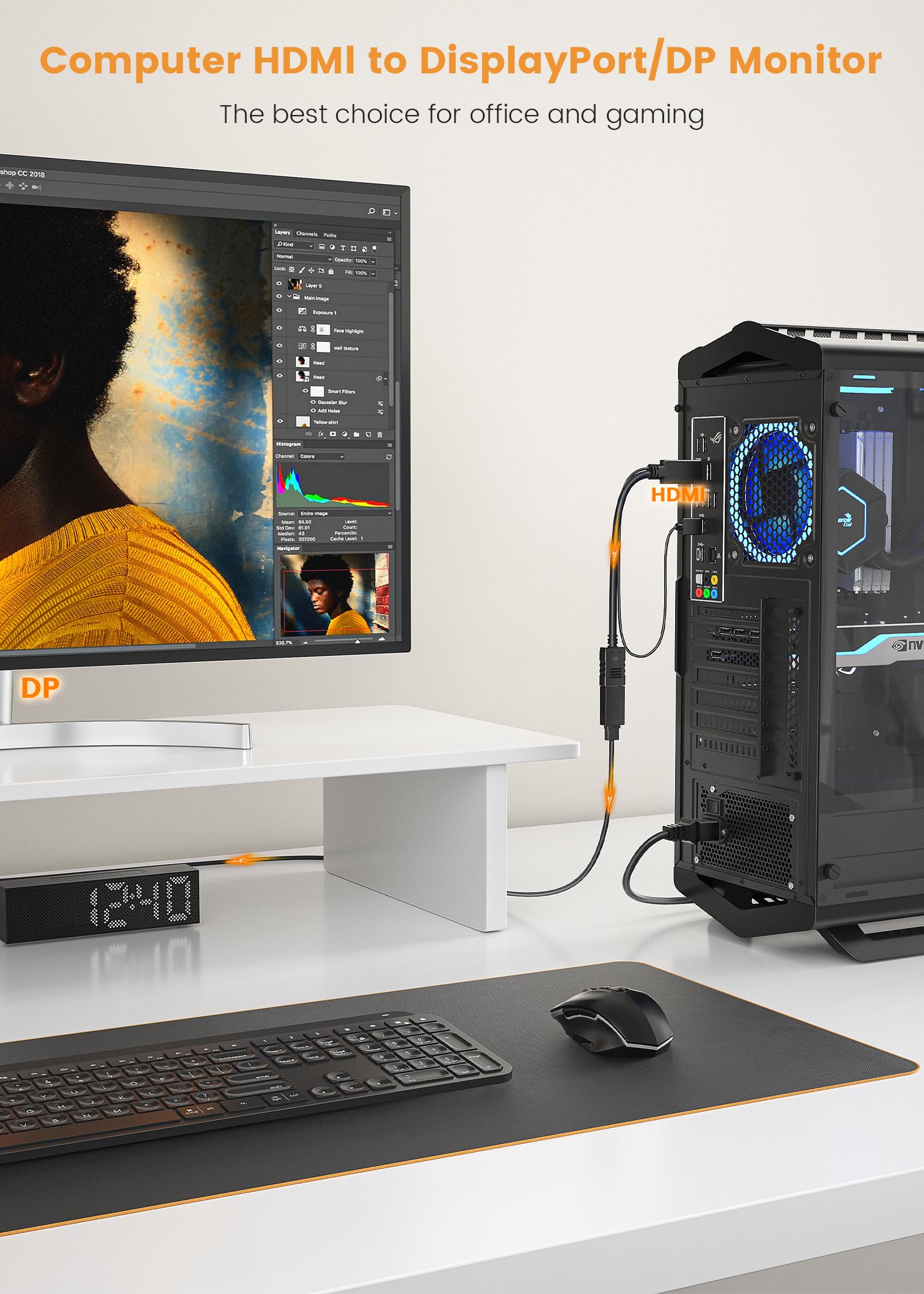 【4K@60Hz HDMI to DisplayPort Adapter】 HDMI to DP Adapter transfer signal from HDMI output source devices to DP input monitor, supports resolution up to 4K (3840 x 2160)@60Hz, 4K@30Hz,1440P@60Hz, 1080P@60Hz. *Note: to get corresponding resolution rate, your PC/laptop and monitor must support the resolution both.