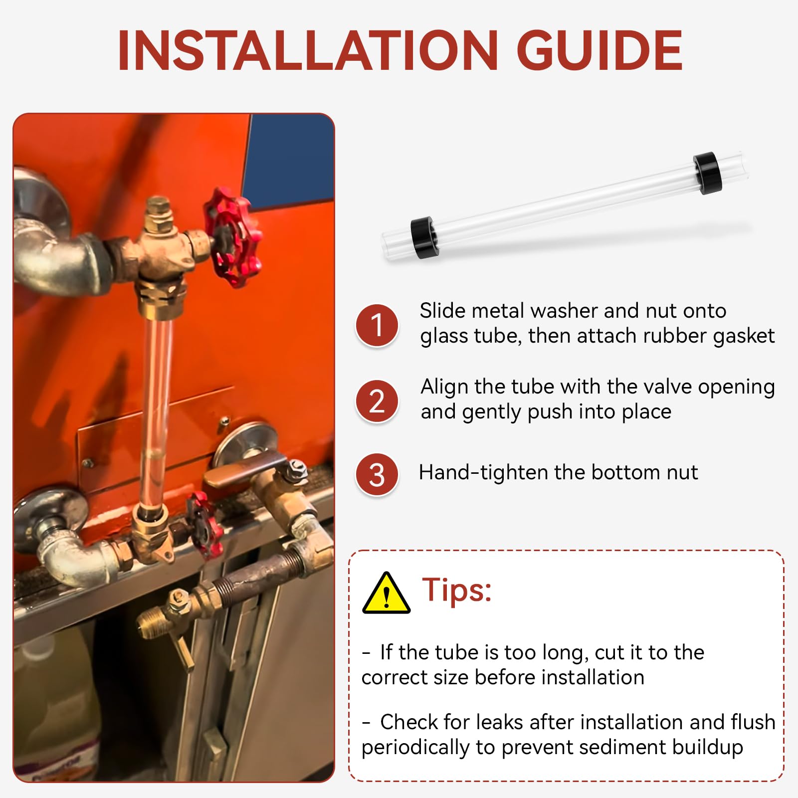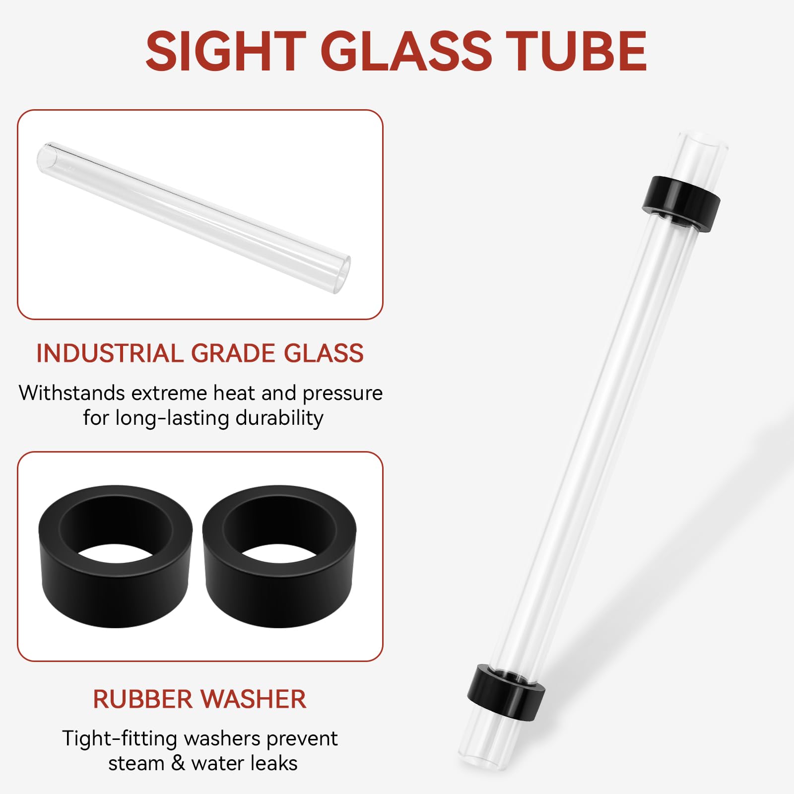 【Heavy-Duty Glass & Rubber Washers】Made from heat-resistant glass, replacement water level gauge tube is resistant to high temperature and pressurit, withstands high-pressure steamer. Includes 2 durable rubber gaskets for a tight, leak-proof seal between the glass and brass fittings.