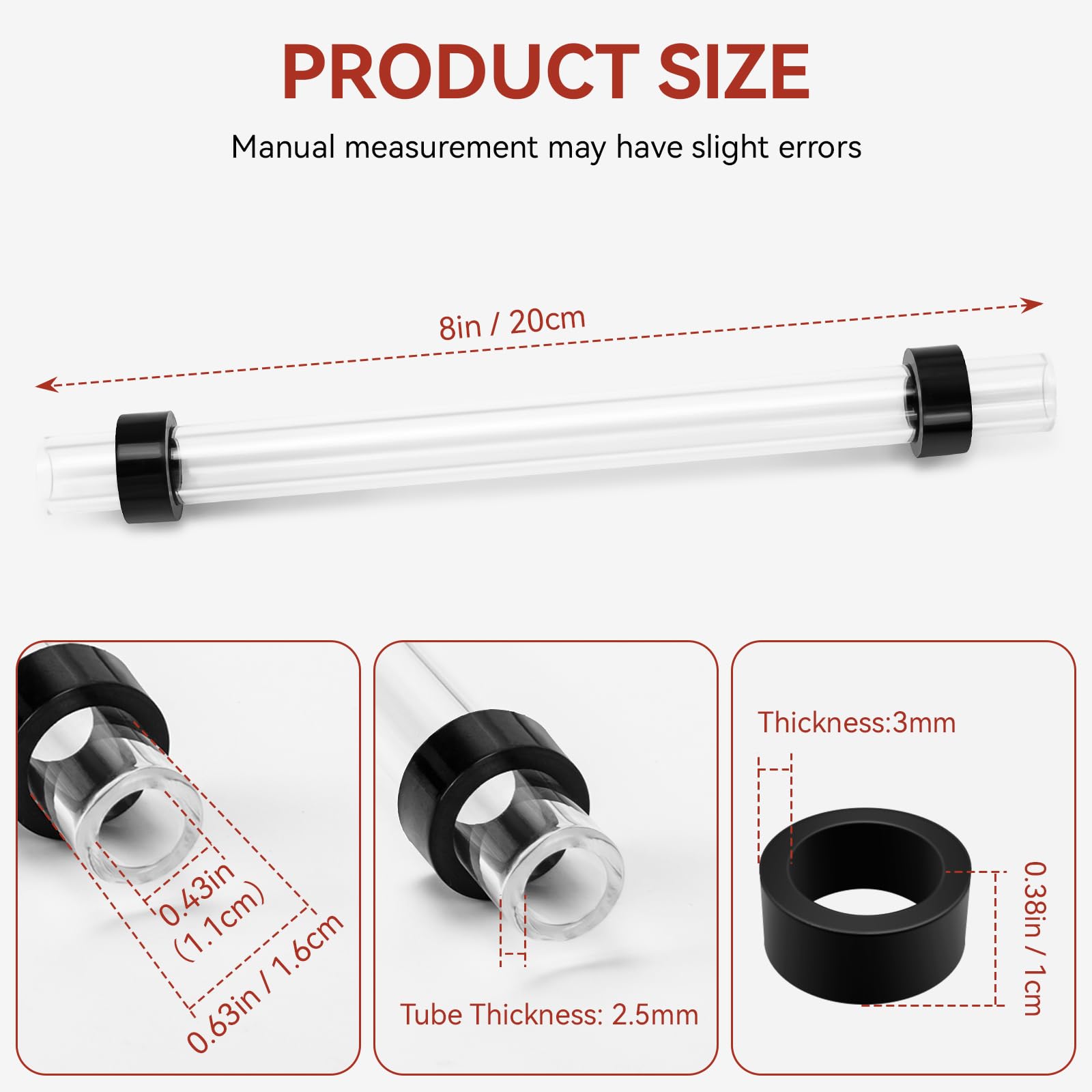 【8 Inch Sight Glass with Washers】This 8 inch thick sight glass gauge tube comes ready to install, 8" Length x 5/8" OD x 3/8" ID. including 2 replacement washers, 3/8" Height x 5/8" ID. Perfect for commercial, or home steamer parts.
