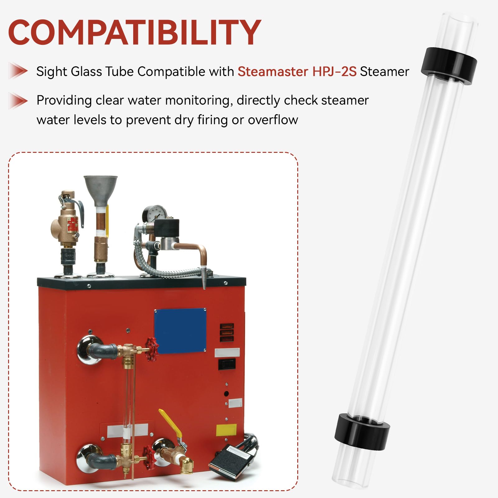 【Sight Glass for Steamaster Steamer】Replacement sight glass tube part #2115-6180, rubber washers parts #2115-605. This steamer sight glass tube is compatible with Steamaster HPJ-2S steamer, providing a direct visual indicator of water levels inside your steamer, ensuring safe operation by preventing dry firing or overfilling.