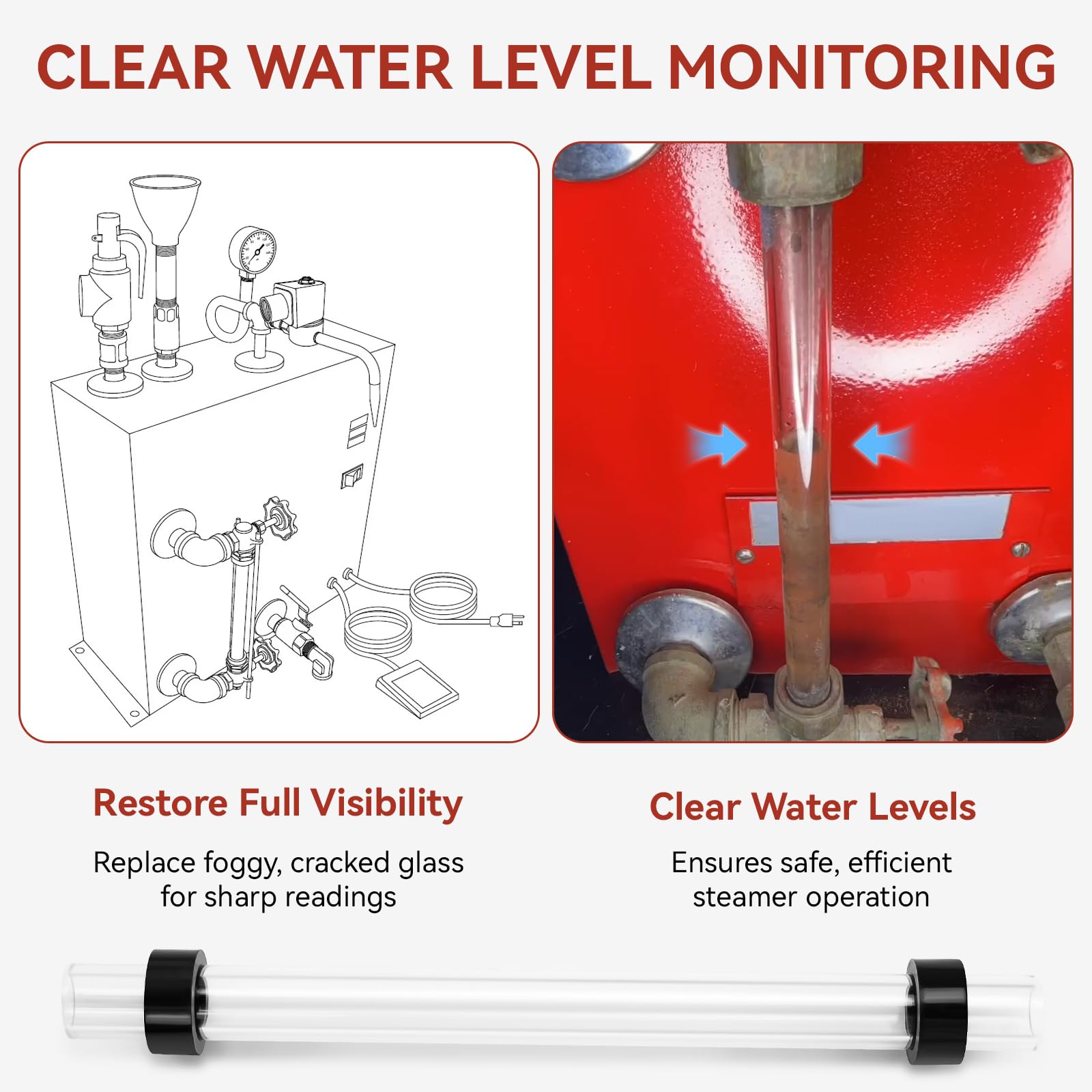 【Clear Water Level Monitoring】Over time, old sight glasses for steamaster HPJ-2S steamer parts can become cloudy, stained, or cracked, making water levels hard to see. Our clear steamer boiler sight glass tube ensures quick, accurate readings for optimal steamer performance.