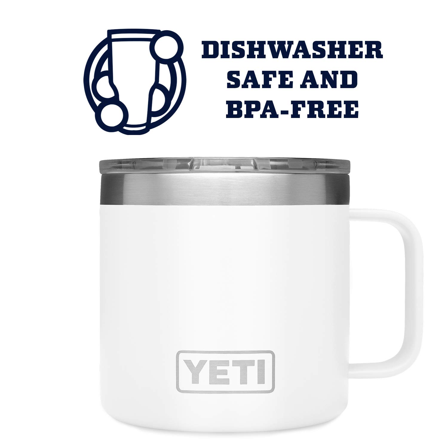 The YETI 14 oz. Rambler Mug stands 3 3/4 in high and has a lip diameter of 4 in, and with the handle its 5 inches wide
