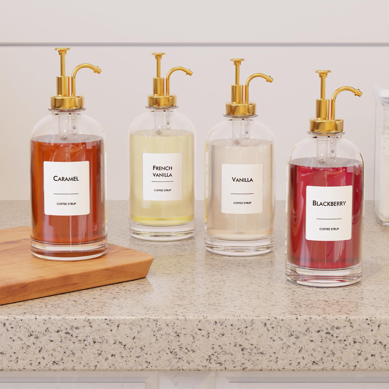 Complete Coffee Syrup Dispenser Set: This set includes 4 high-quality glass bottles (16.9 oz/500 ml) with pumps, a funnel, and 28 syrup labels to keep your coffee bar organized and stylish.