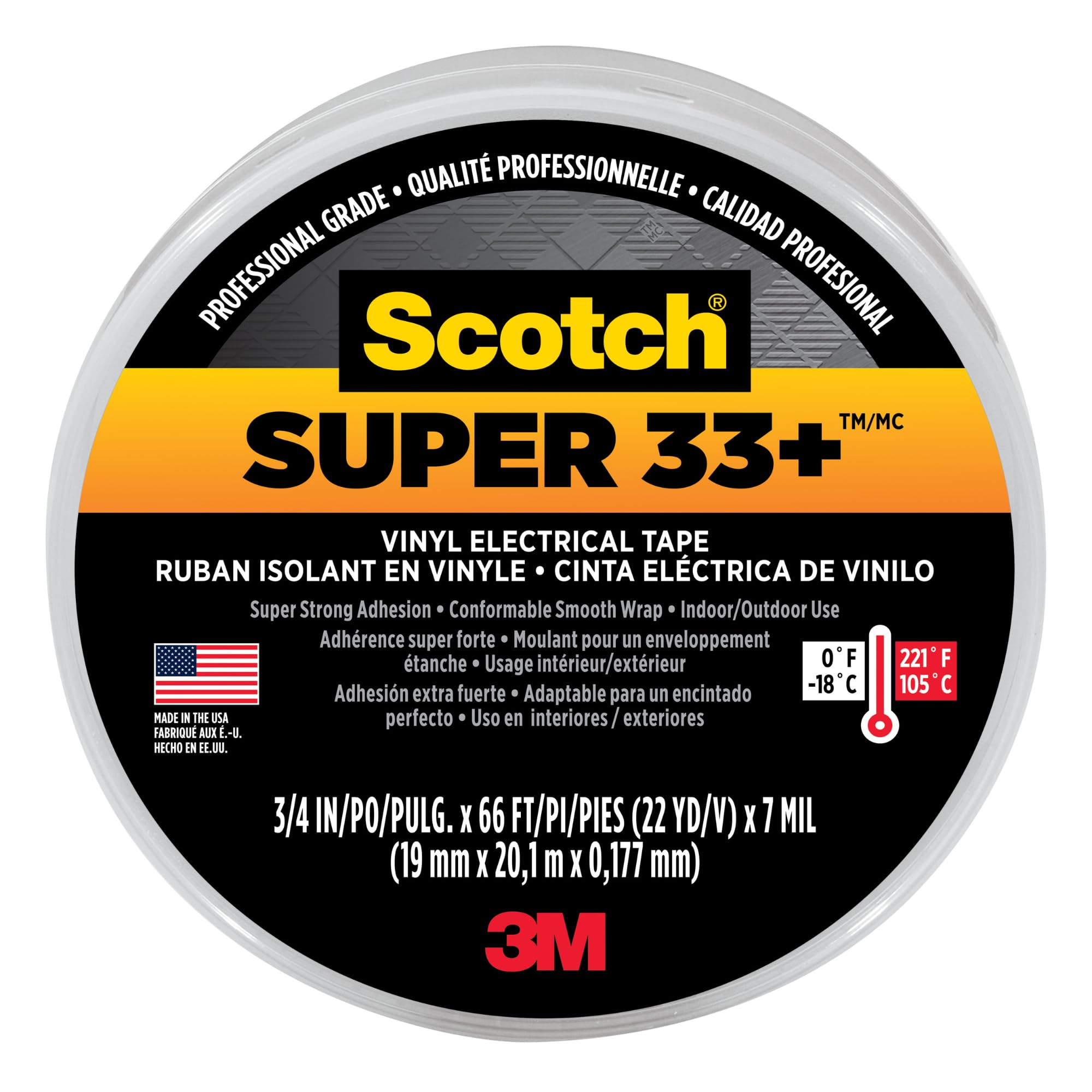 3M Scotch Super 33+ Vinyl Electrical Tape is a black, 7 mil premium grade all-weather vinyl electrical insulating tape with an aggressive adhesive and elastic backing that enables it to easily conform to irregular surfaces for water-resistant electrical and mechanical protection.