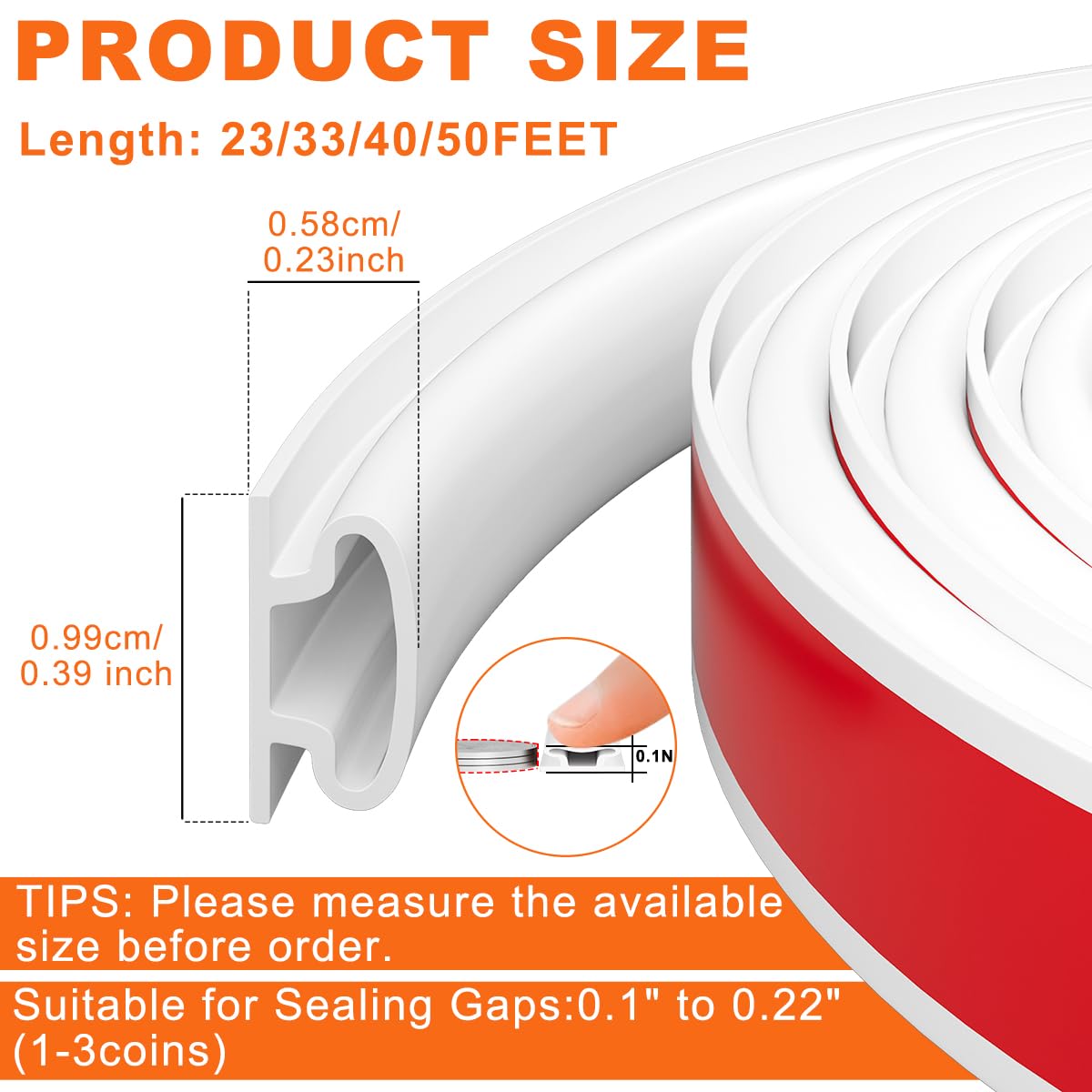 【CUSTOMIZABLE IN A VARIETY OF SIZES】This weatherstripping is easy to customize, can be cut to size with scissors, and can be easily bent into any shape. Overall length 50 feet, width: 0.35 inch; thickness: 0.23 inch; fits gaps and spacing from 0.1 to 0.22 inch.NOTE: Please measure the width of the gap before purchase