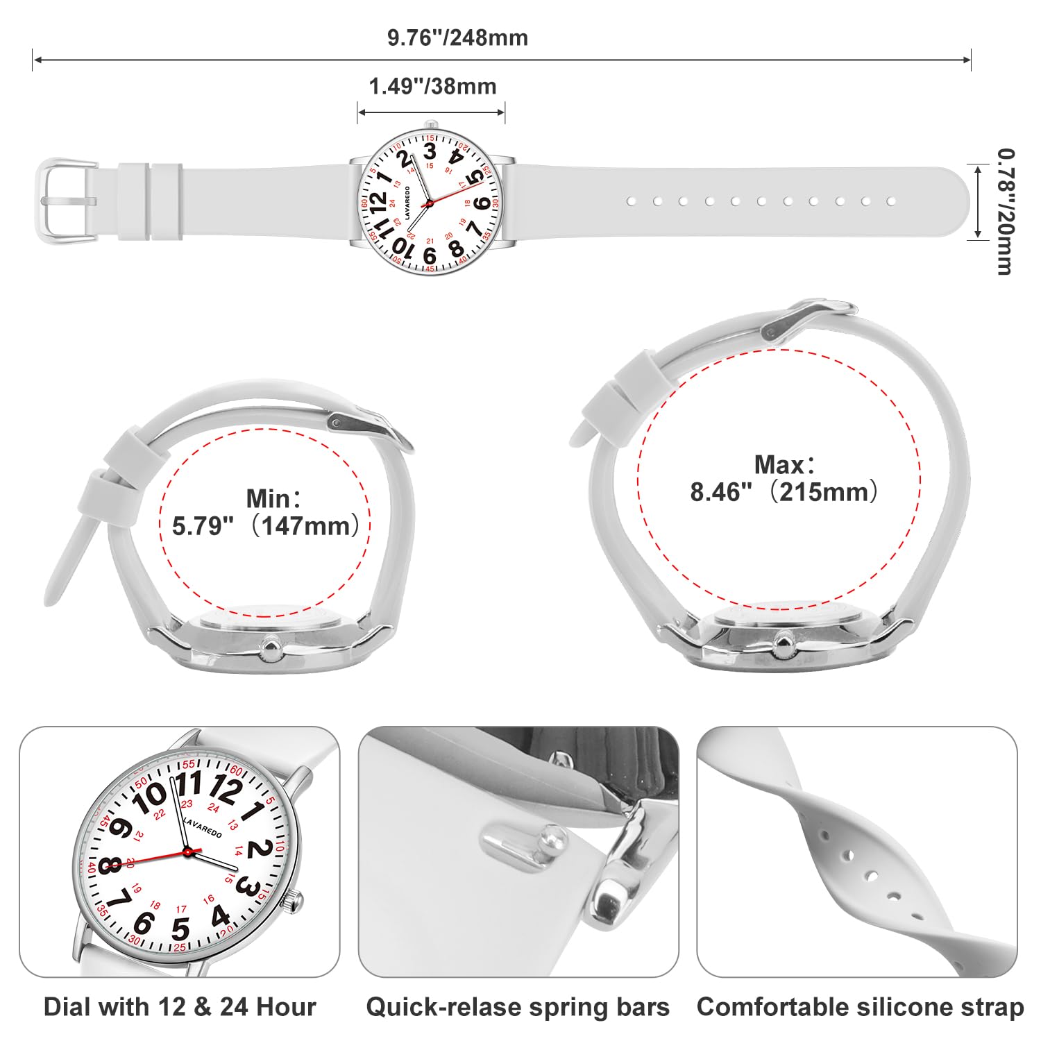 EasyRead & Military Time:Easy-to-read dial with 12/24 hour,luminescent face and MINUTE/HOUR hand for night-time visibility.The soft silicone strap is extremely comfortable to wear and the lightweight size is perfect for use at work