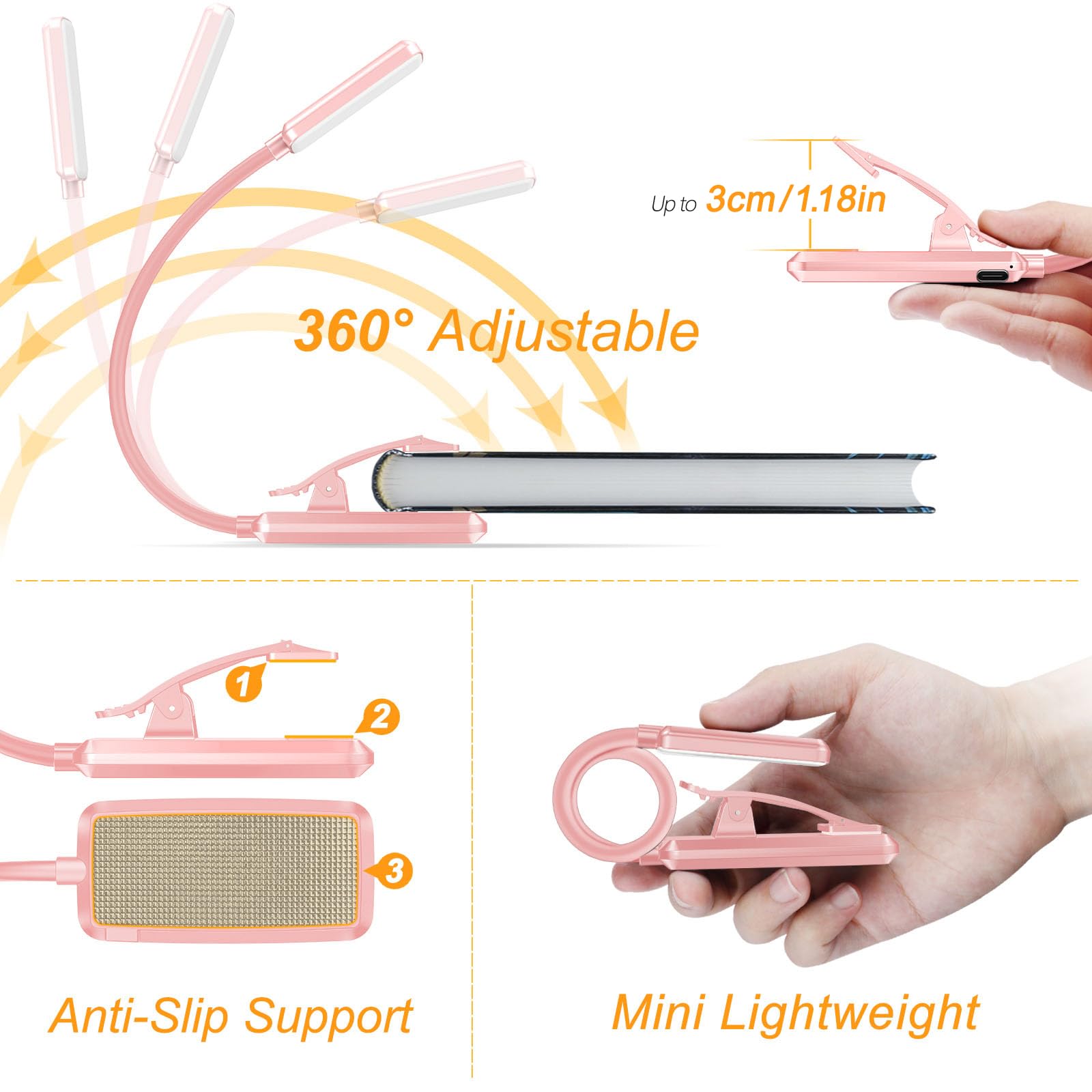 360° Flexible Neck & Sturdy Clip: 360° bendable goose neck can be rotated to any angle you want. Anti-skid clip design makes it firmly clamp on an e-reader, books, shelf, etc.