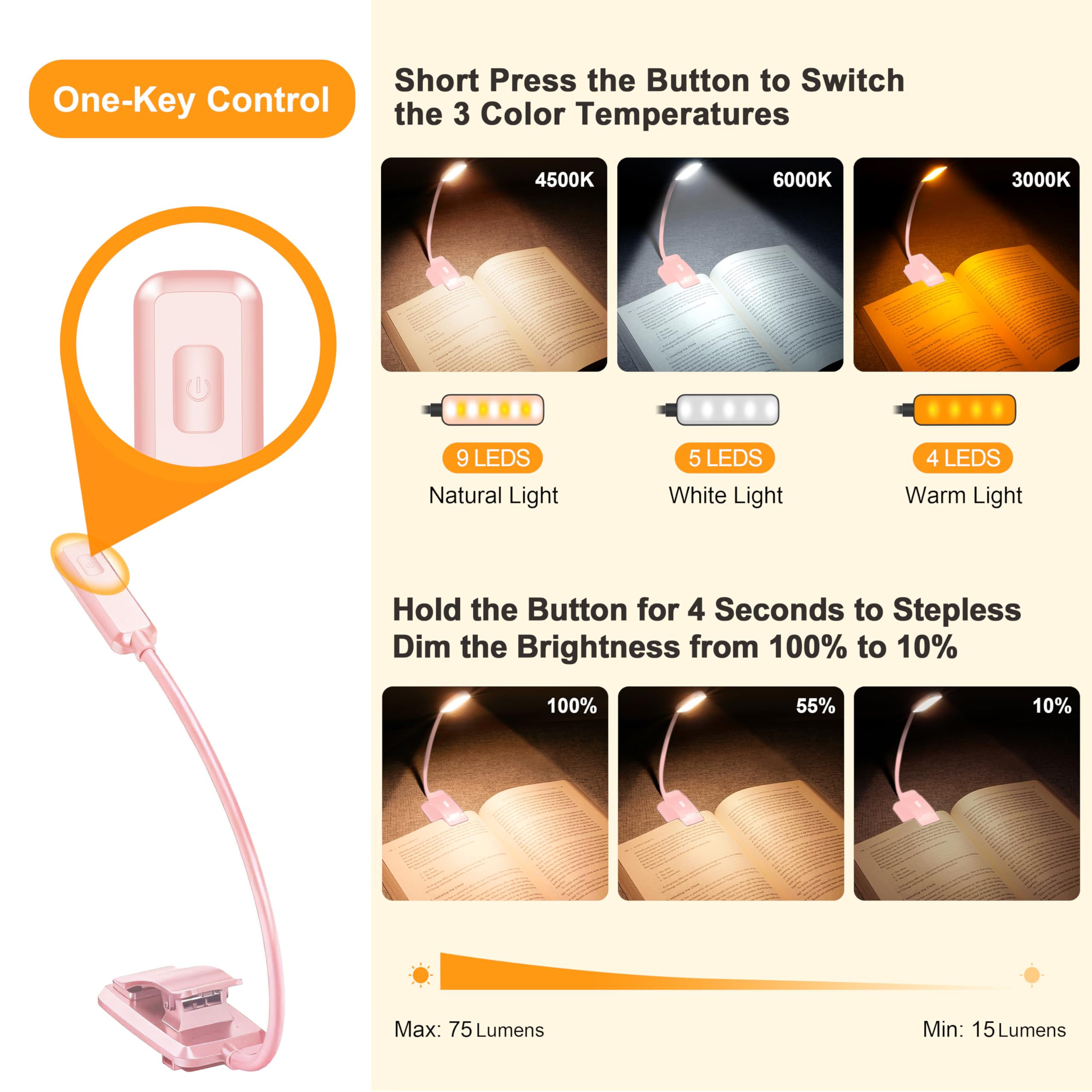 Stepless Dimming and 3 Color Modes: Adjust the brightness from 100% to 10% by long press button to suit different reading environment. Simple switch 3 color temperature lighting modes by clicking the button: mixed color, cool white, warm