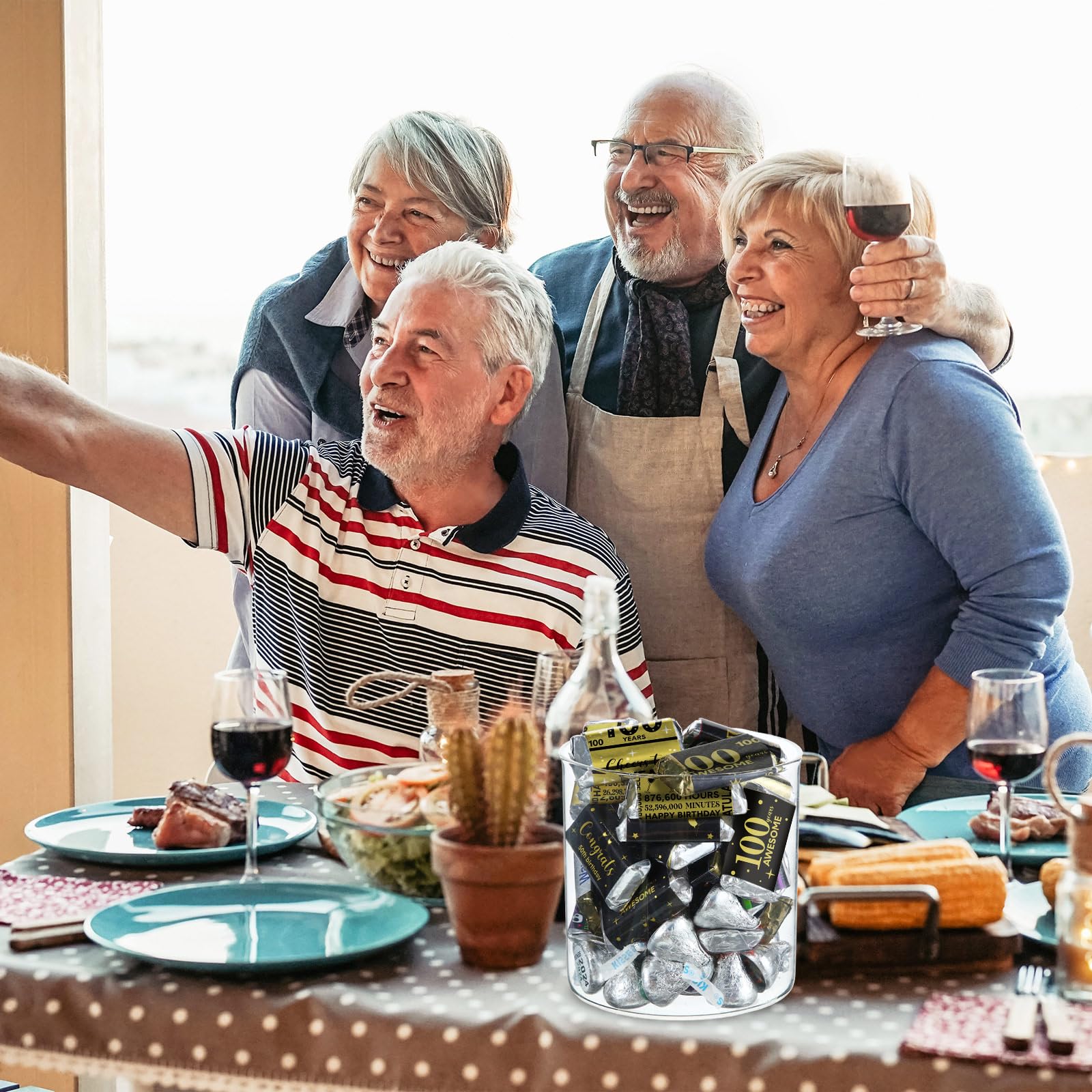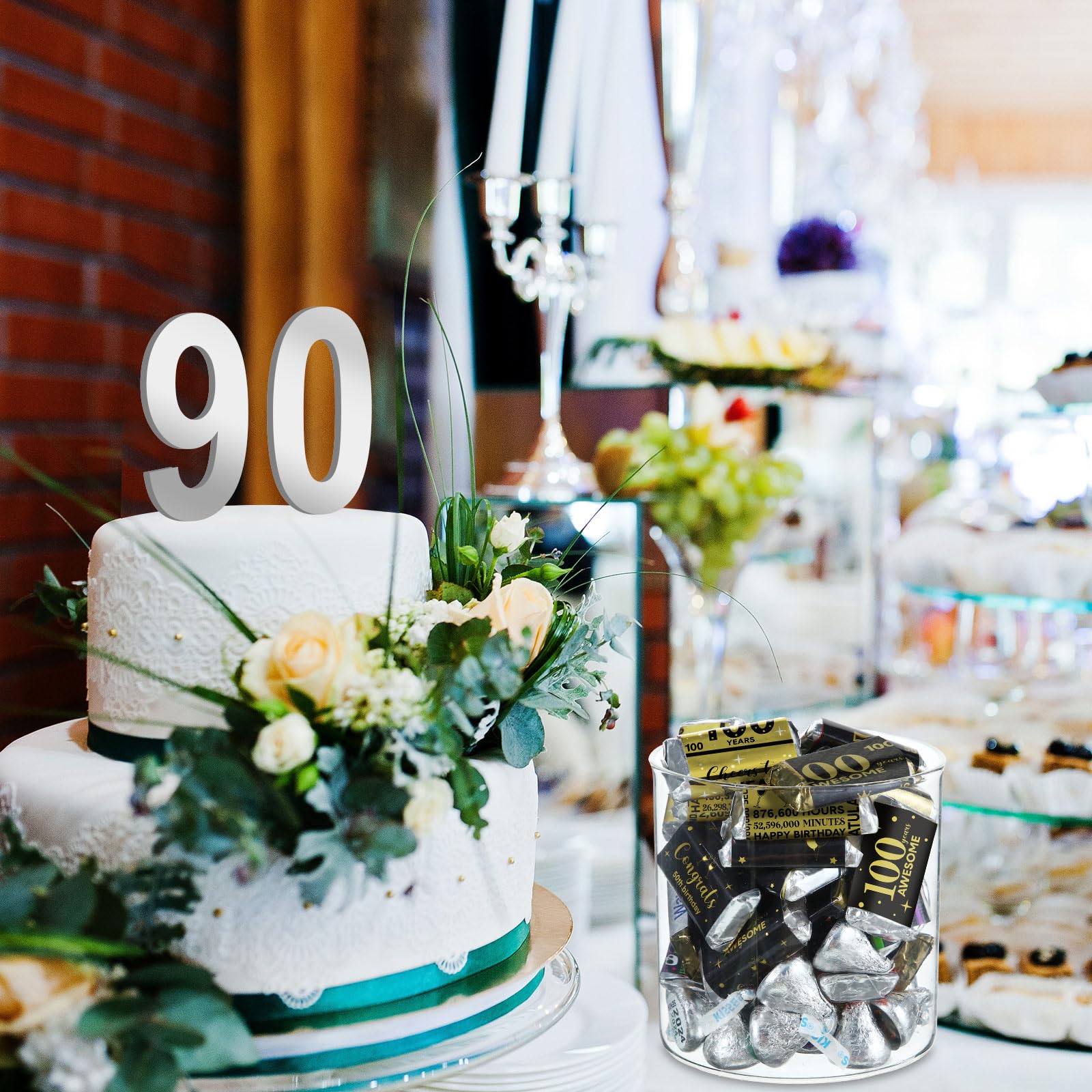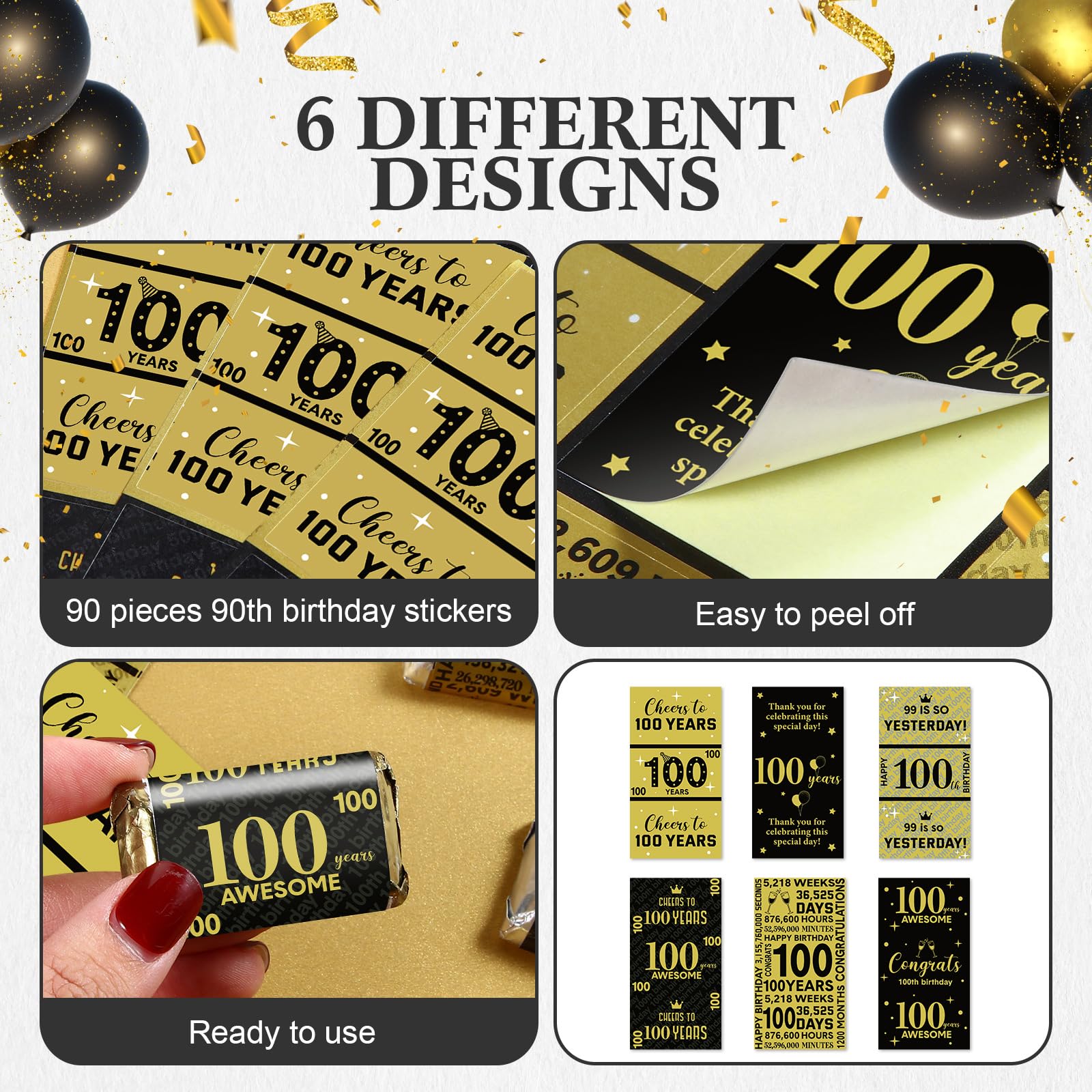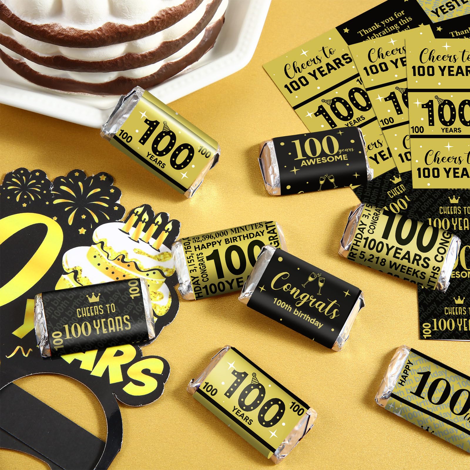 100 Years Elements: shiny metallic wrappers are full of classic 100th birthday elements, such as [cheers to 100 years], [100 years awesome], [congrats 100th birthday], [100 years] and so on, well catching guests' eyes and easily bringing you lively birthday party atmosphere