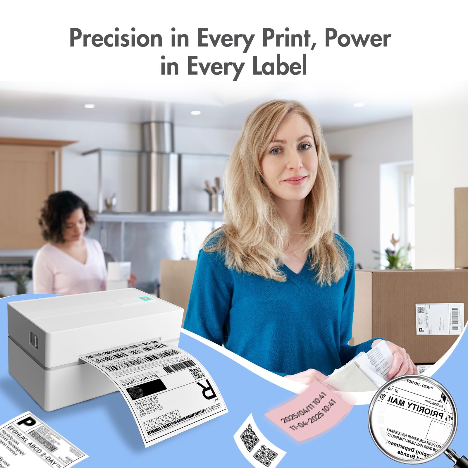 Multi-Label Size Support: Supports thermal labels with a width of 1.57" to 4.3", Compatible with 4x6, 3x2, and custom-sized labels to adapt to diverse packaging needs. (Note: thermal printers can only print in black and white, and comes with 25 sheets of waterproof label paper.)