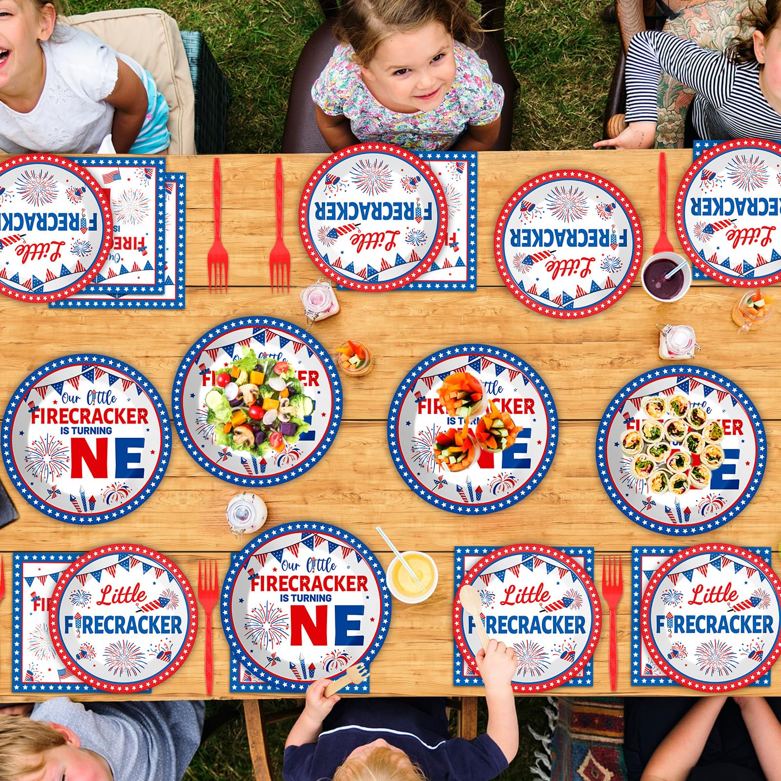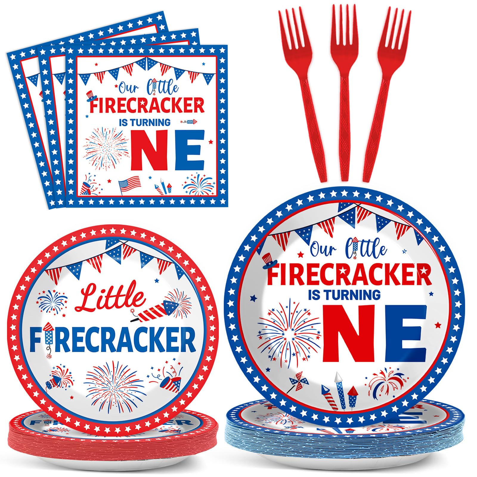 Package includes: You'll get 24pcs of little firecracker dinner plates of 9in, 24pcs of little firecracker dessert plates of 7in, 24pcs of little firecracker napkins of 6.5in, and 24 pieces of plastic forks for each set that can serve 24 guests, creating a visually stunning table decor for your party.