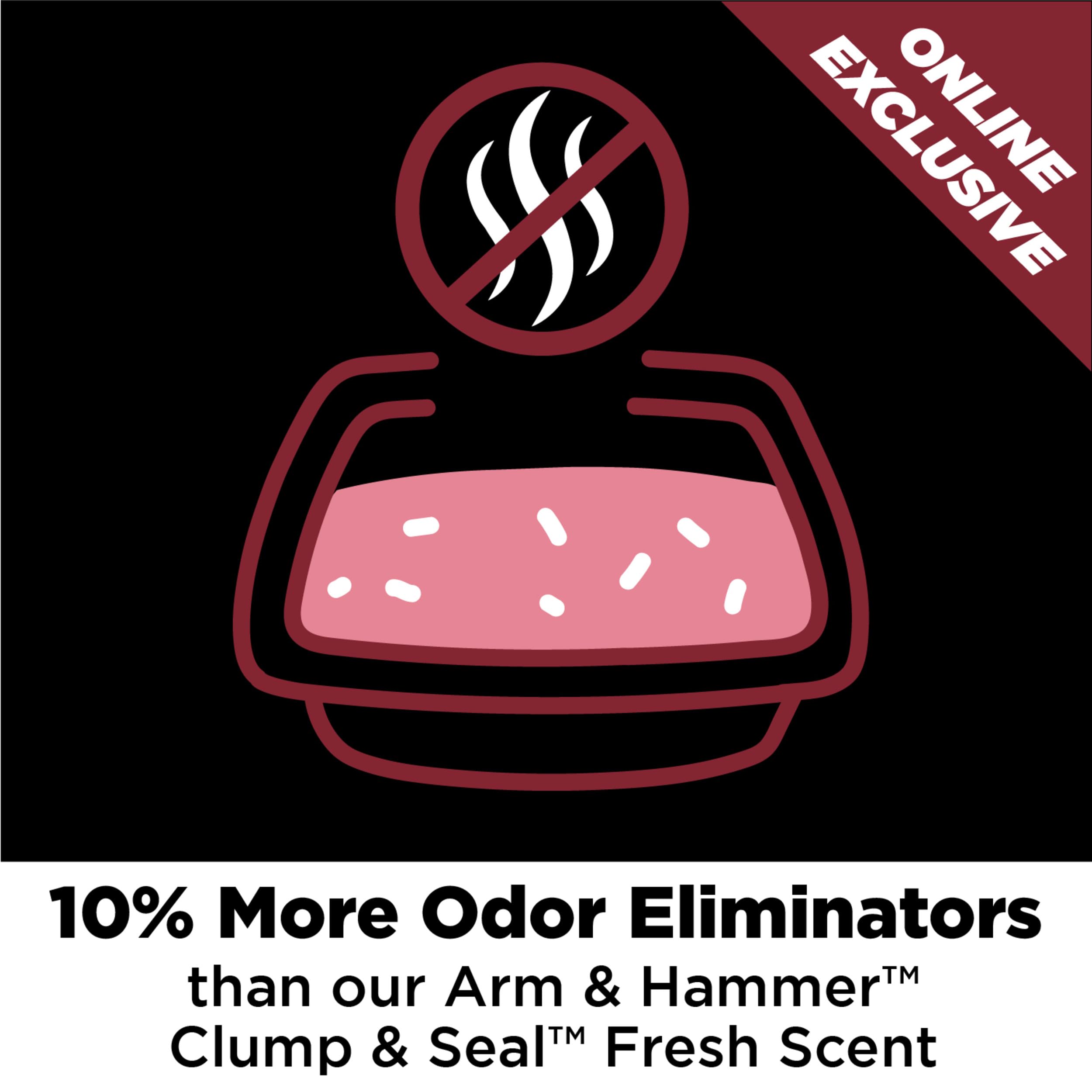 Keep your home fresh with ARM & HAMMER Clump & Seal Platinum Multi-Cat Clumping Cat Litter. Designed for multi-cat households, this premium litter guarantees 14 days of odor control. Featuring patented odor-sealing technology and 10% more odor eliminators than our standard formula, it locks in and destroys odors on contact. Moisture-activated micro-granules form rock-hard clumps for easy scooping. Infused with ARM & HAMMER Baking Soda, this litter is your go-to solution for powerful odor elimination and a cleaner litter box experience.