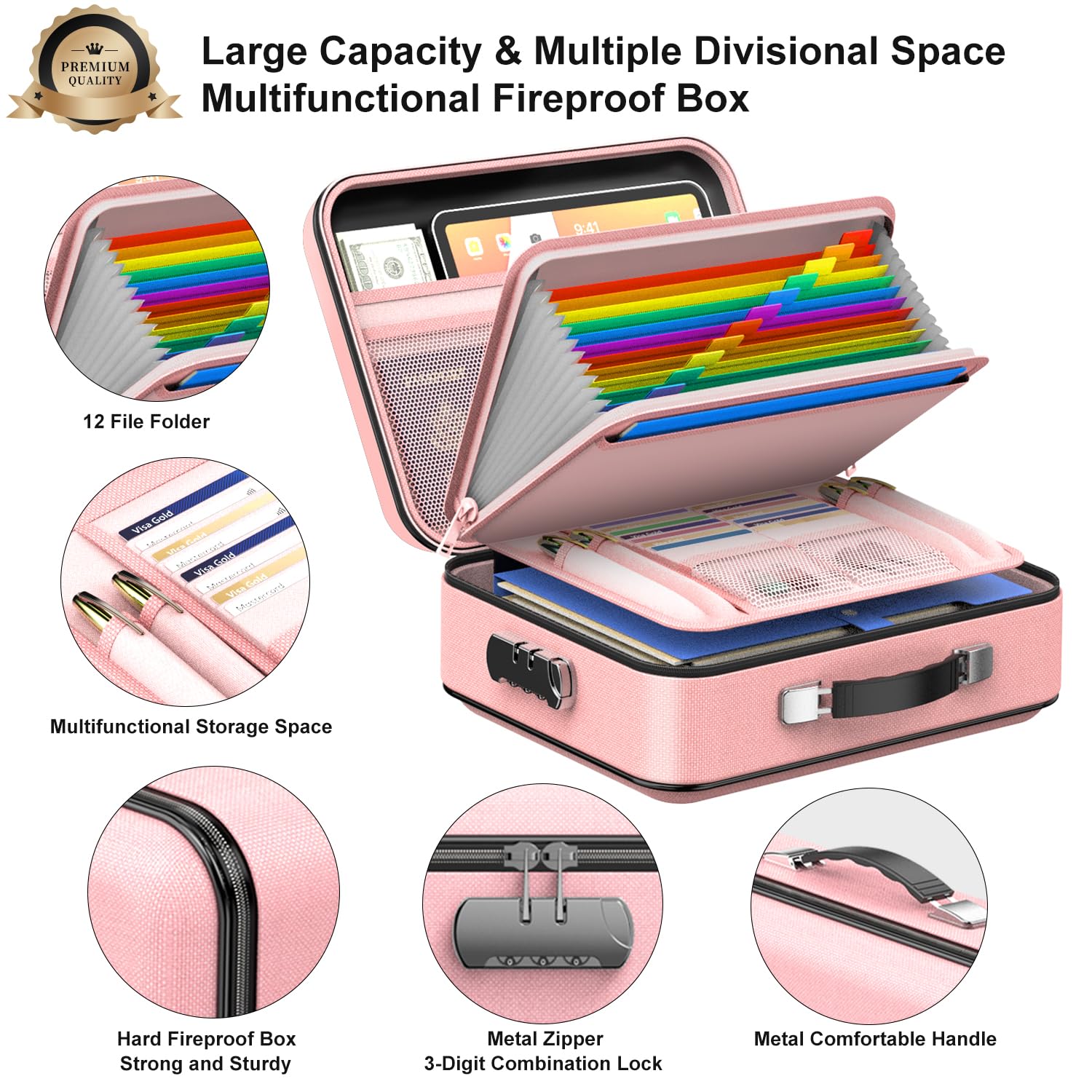 Large Capacity Fireproof Document Organizer – Outside size :15 x 11 x 5 inches (Inside Size : 14.4 x 10.4 x 4.4 inches ) large capacity fireproof safe box equipped with 12 accordion bags, 2 main mesh bags, 16 card slots, 2 U Disk pockets, 4 pens slots etc. Enough big space to store your laptop documents, money, passport, U disk, pens, cards, certificates in a safe and orderly way.
