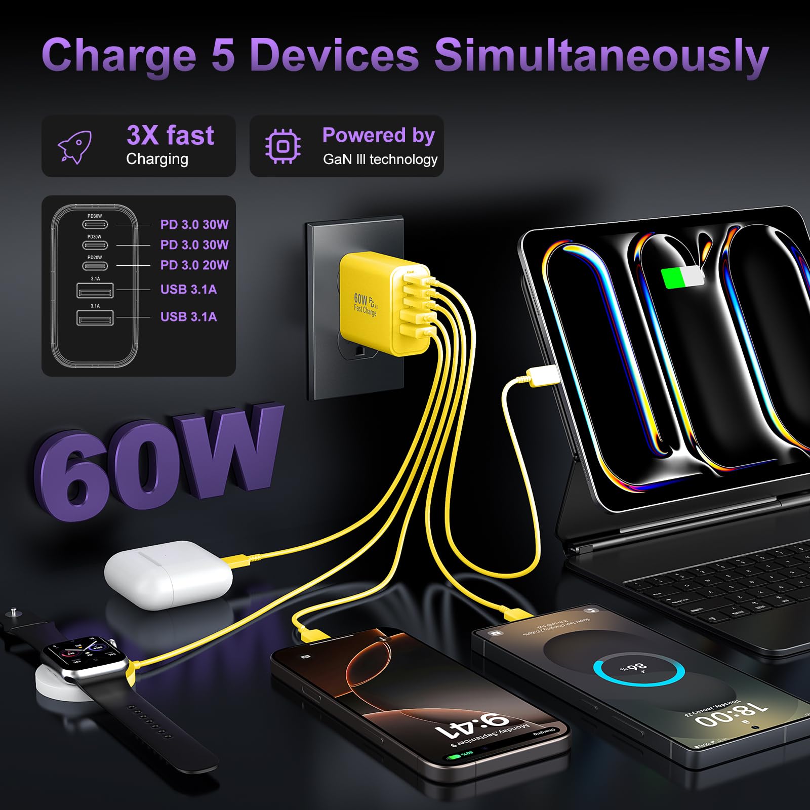 Compact and Portable Phone Charger Brick: Designed with the pocket-friendly compact body and 5-port charging cube, the USB C box is integrated to charge multiple devices at home, office and travel. Small size saves you space and fits perfectly into pockets, handbags, travel cases. Packaged with dual 60W 5-port usb c wall chargers (cable not included). If you have any problems with the c type charger block, please contact us