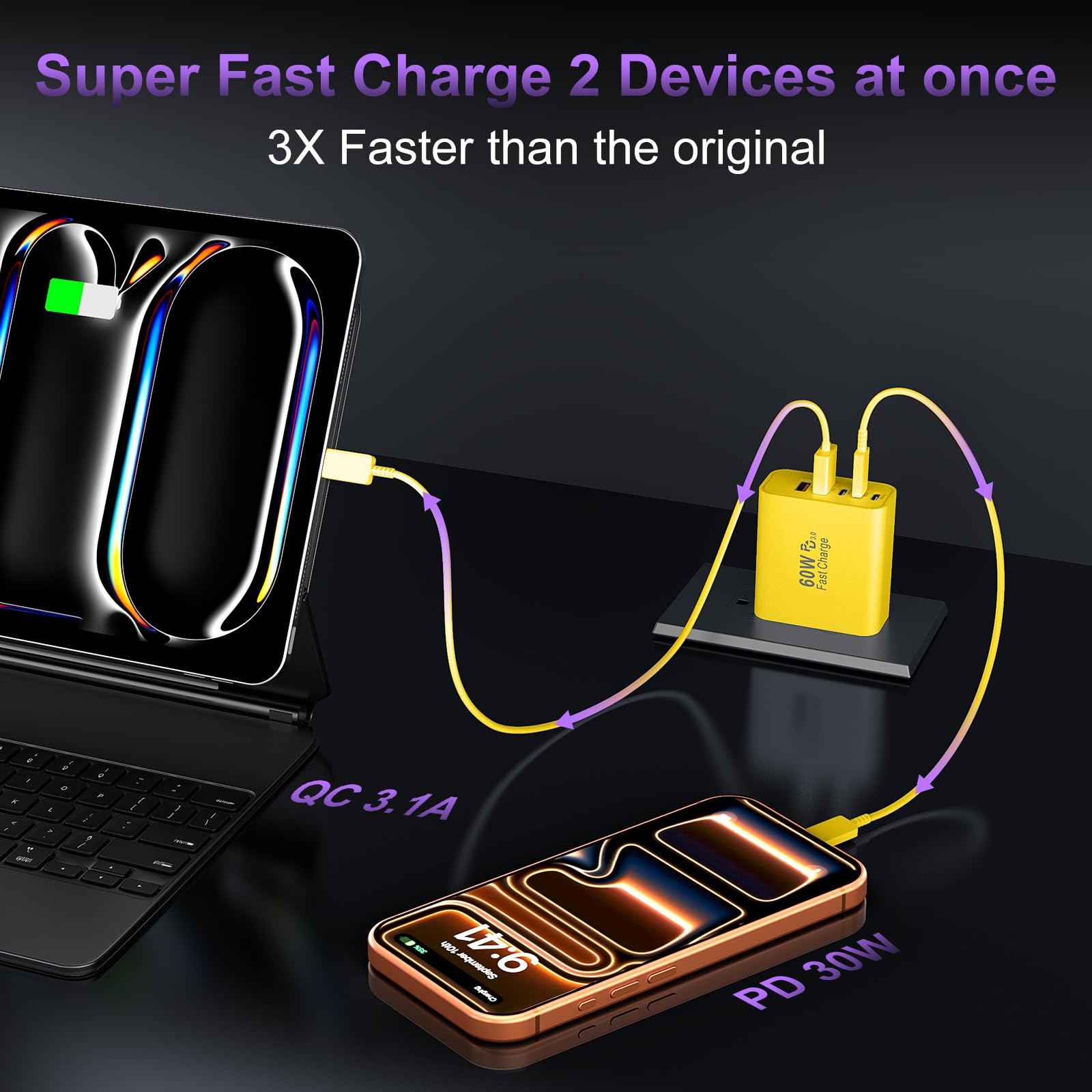 2-Pack 60W USB C Charger Fast Charging Blocks: Auorld 60W USB C Fast Charging Blocks support the Power Delivery and Quick Charge 3.0 fast charging functions with a total power of up to 60W. The USB-A port offers an output power of 3.1 A/5 V, while each USB-C port provides Max 30W output power, charge your Phone 16 15 Pro Max up to 65% in just 30mins, 10% faster than the original 20W USB C charger