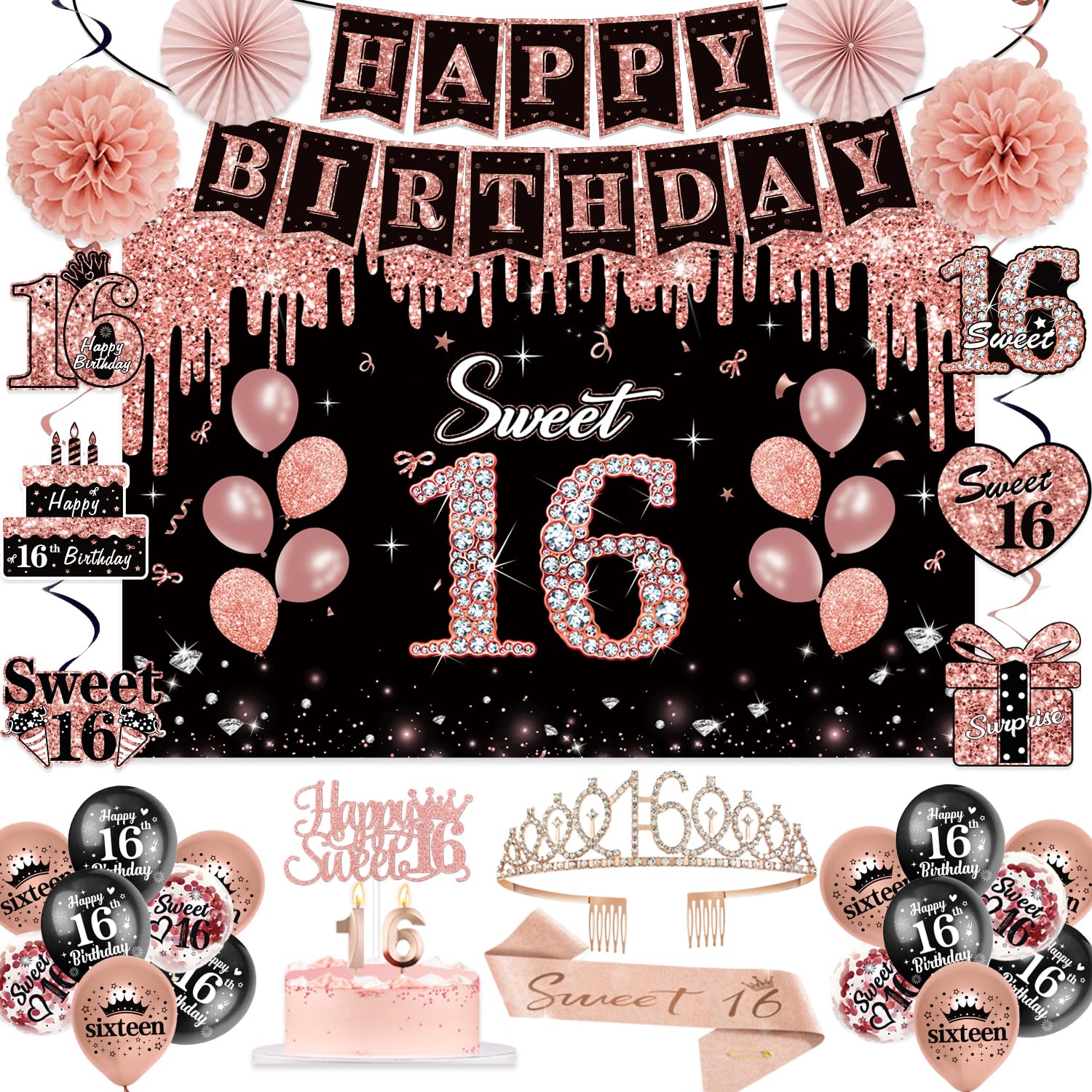 Happy 16th Birthday Banner Party Decorations -Material: polyester fabrics -Size: 6x 1.3ft -Color: black, rose gold -Package includes: 1 x "Happy 16th Birthday" banner [Reminder: There are no poles or stakes in the package] -Easy to use: It is very easy to assemble. The banner has four copper holes and is equipped with rope. You only need to pass through the copper hole to easily hang it anywhere you want to decorate. -Suitable for: Very suitable for your 16th birthday party and other happy sweet 16 party activities. It can be hung on walls, balconies, yards, gardens, lawns and other places you like.