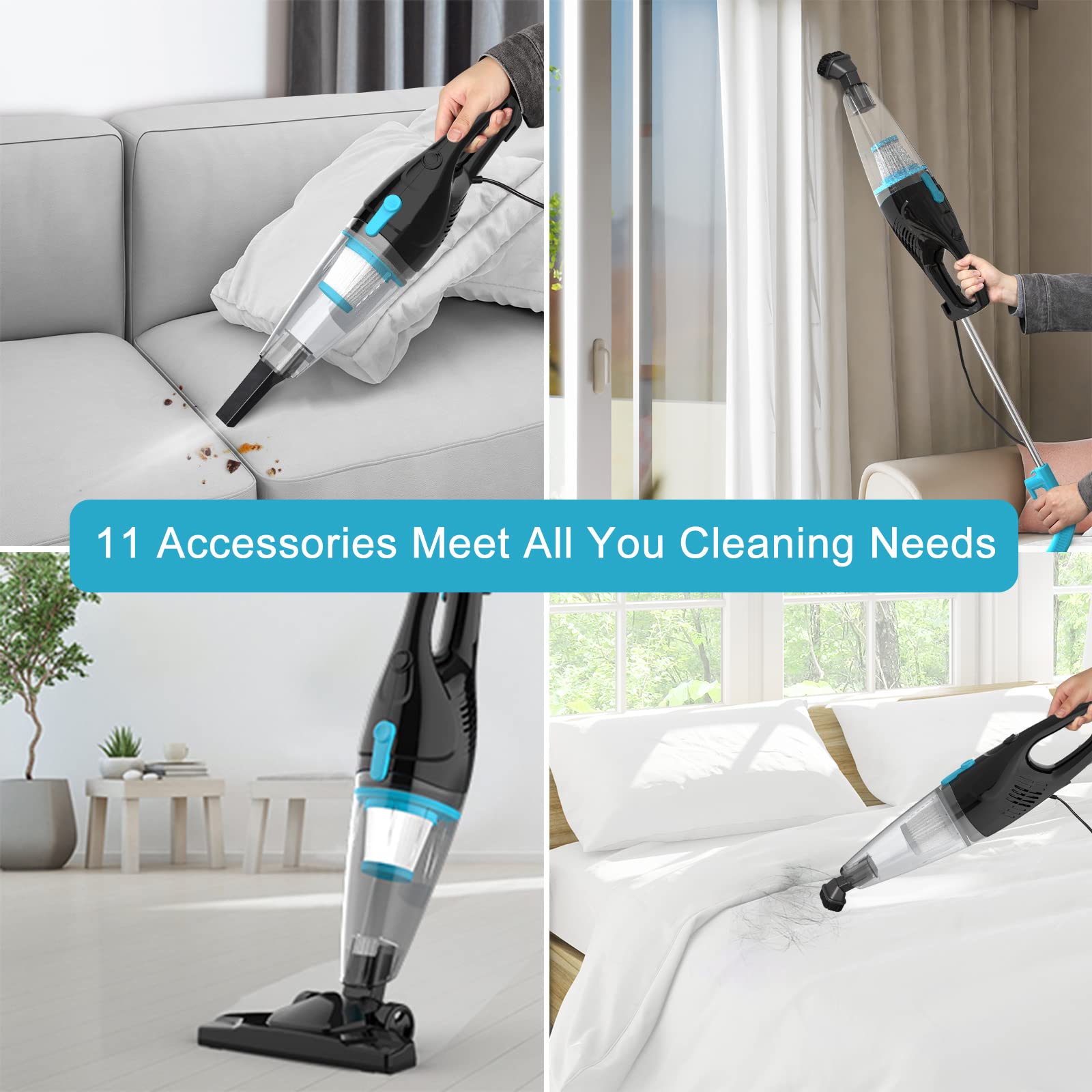 【12 in 1 Multifunction】: Our lightweight vacuum cleaner equipped with 11 accessories that can be connected to adapt to the cleaning of any where. Dusting brush, all kinds of crevice nozzle, and extension wand efficiently and thoroughly clearing debris, dust, crumbs, reducing hair entanglement, it meets diverse cleaning needs for hard floors, such as wooden floors and marble, stairs, windowsills, beds, and sofas.