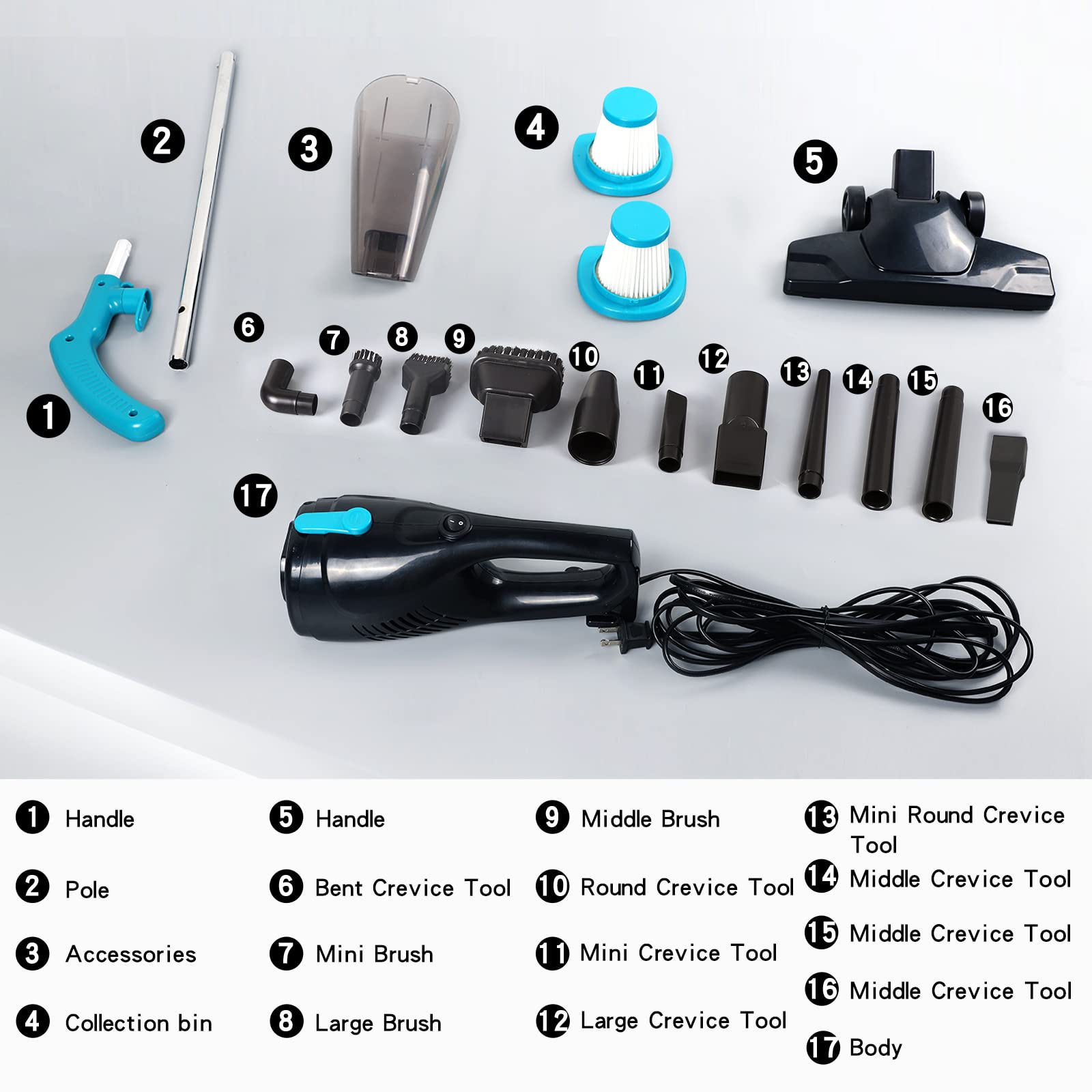 【16.4ft Extra Long Cord】: 16.4 ft power cable can make small vacuum have a broad range of use. You don' need to change the plug-in position frequently as the cleaning place changed. It's much more convenient when compared to standard corded vacuum cleaners. Let you experience powerful suction as well as get rid of runtime constraints.