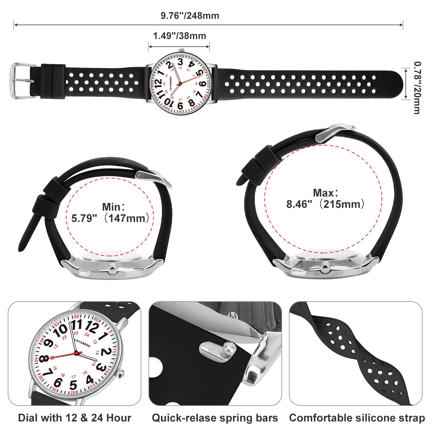 EasyRead & Military Time:Easy-to-read dial with 12/24 hour,luminescent face and MINUTE/HOUR hand for night-time visibility.The soft silicone strap is extremely comfortable to wear and the lightweight size is perfect for use at work