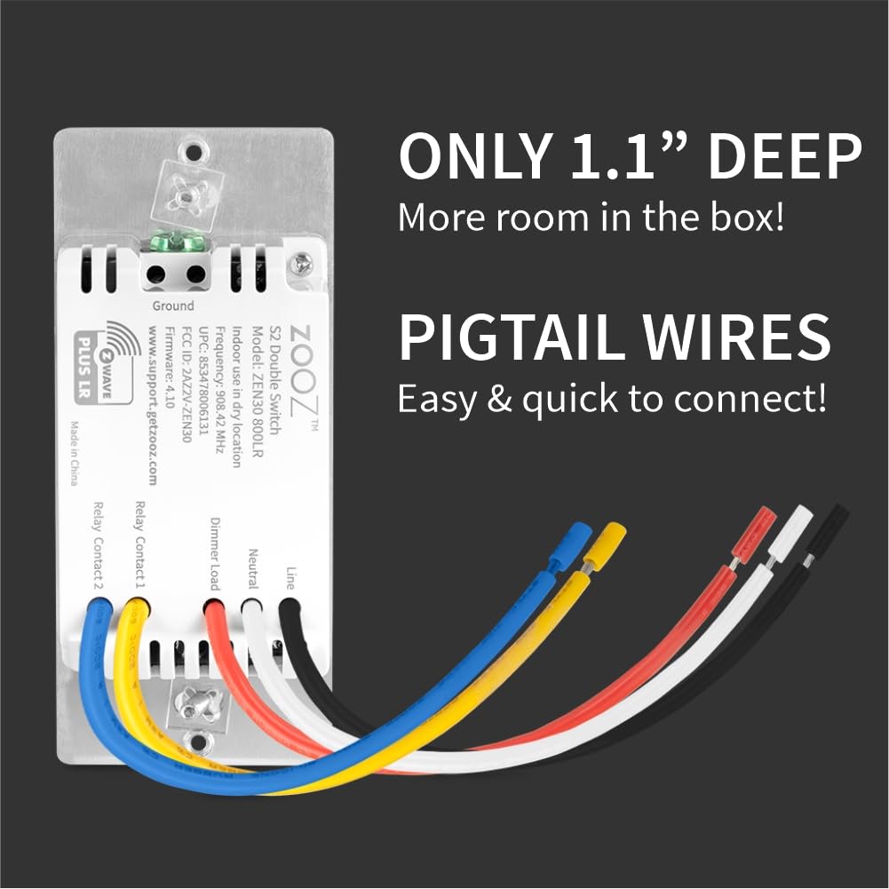 NOTE: Check Wattage first: DON'T exceed 75 W of LEDs for the dimmer. Do NOT connect this device to regular or add-on switches in 3-way or 4-way installations. NEUTRAL WIRE REQUIRED. SPECIFICATIONS: Model Number: ZEN30 800LR Z-Wave Region: US, MX, CA Power: 110-120 V AC, 60 Hz Maximum Load for Dimmer: 75 W LED, 250 W incandescent (don't use with tube lights, chandeliers, switched receptacles, or fans) Maximum Load for Relay: 15 A Z-Wave Range: Up to 100 feet line of sight Dimensions: 1.7" x 4.1" x 1.1" Operating Temperature: 32-104° F (0-40° C) Installation and Use: Indoor only Will it work with my smart speaker? Smart speakers are NOT Z-Wave controllers so you will need a compatible Z-Wave hub to control this device with your smart speaker. Voice-control-compatible Z-Wave hubs include: Home Assistant SmartThings Z-Box Hub Hubitat