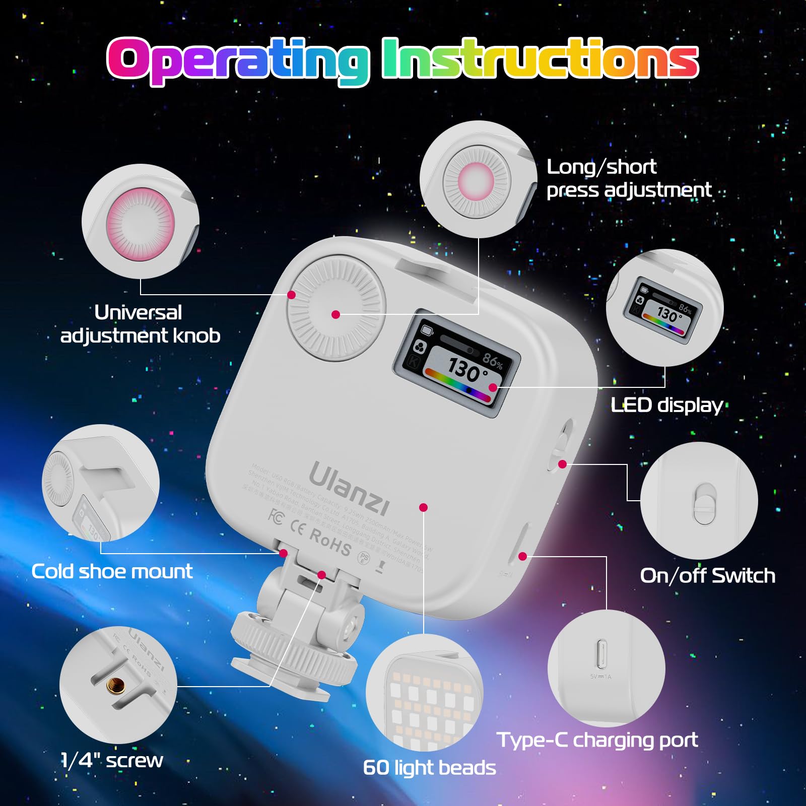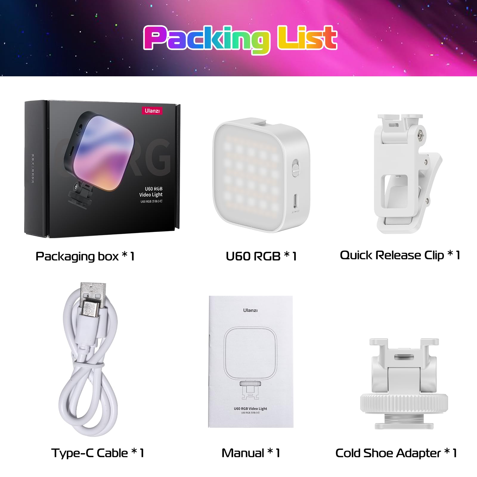3 Ways to Mount: ULANZI U60 RGB Selfie Light with quick release Clip,Max.Clip Width 0.78in/2cm, the clamp incredibly stable, not easily falls down, widely applicable to various iPhone or android cellphone, iPad, tablet, laptop, ect. The photography light is equipped with the 1/4-inch screw that can be attached to a camera, tripod, microphone mount, light stand or other, also support using a quick release cold shoe adapter on the bottom.