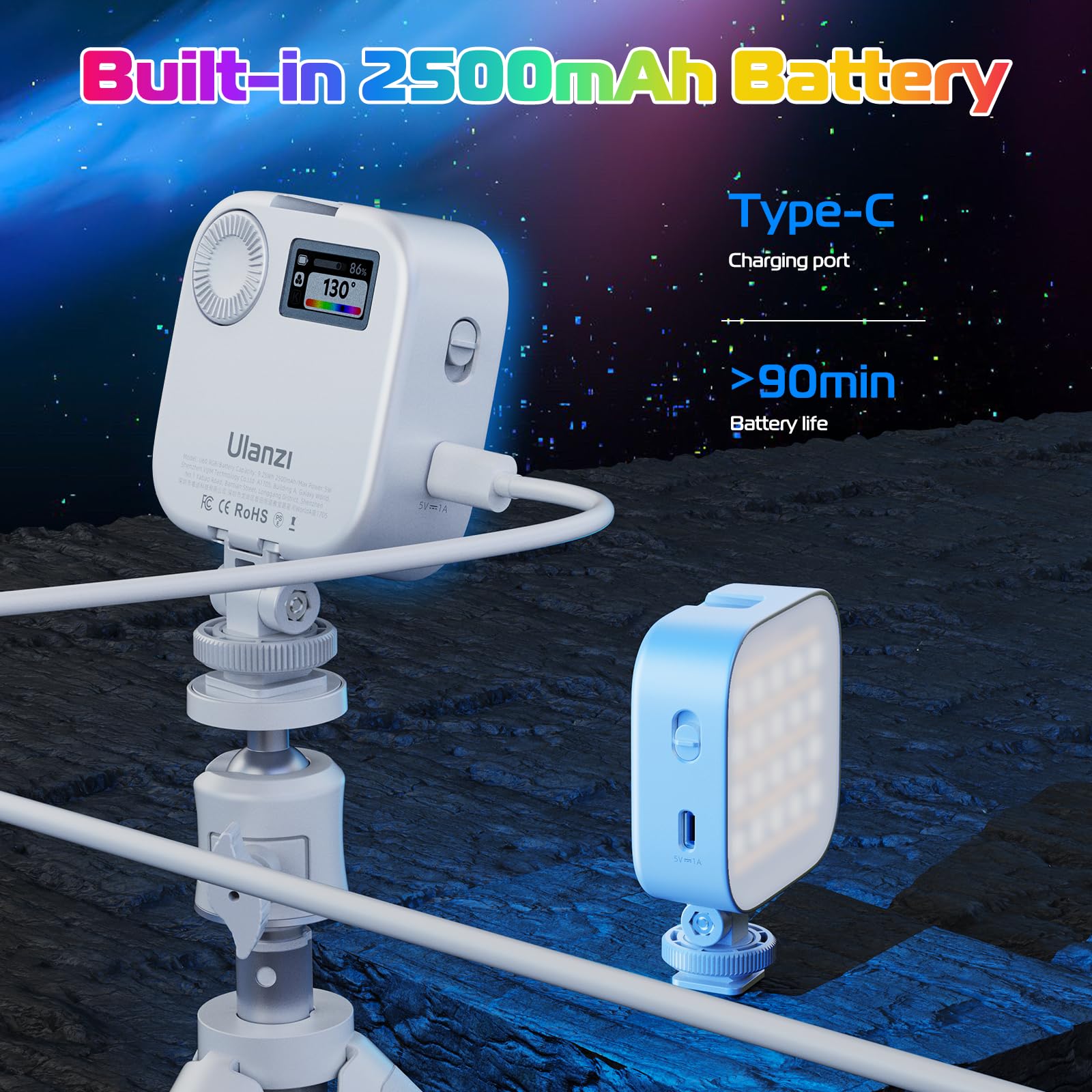 2500mAh Large Capacity Battery: The mini led lights is built-in 2500mAh rechargeable lithium battery, charging time is about 4 hours, max brightness output up to 90 mins, min brightness output up to 10 hours. With Type-C charging port on camera video light, It also can be used while charging, no longer need to worry about the problem of insufficient battery.