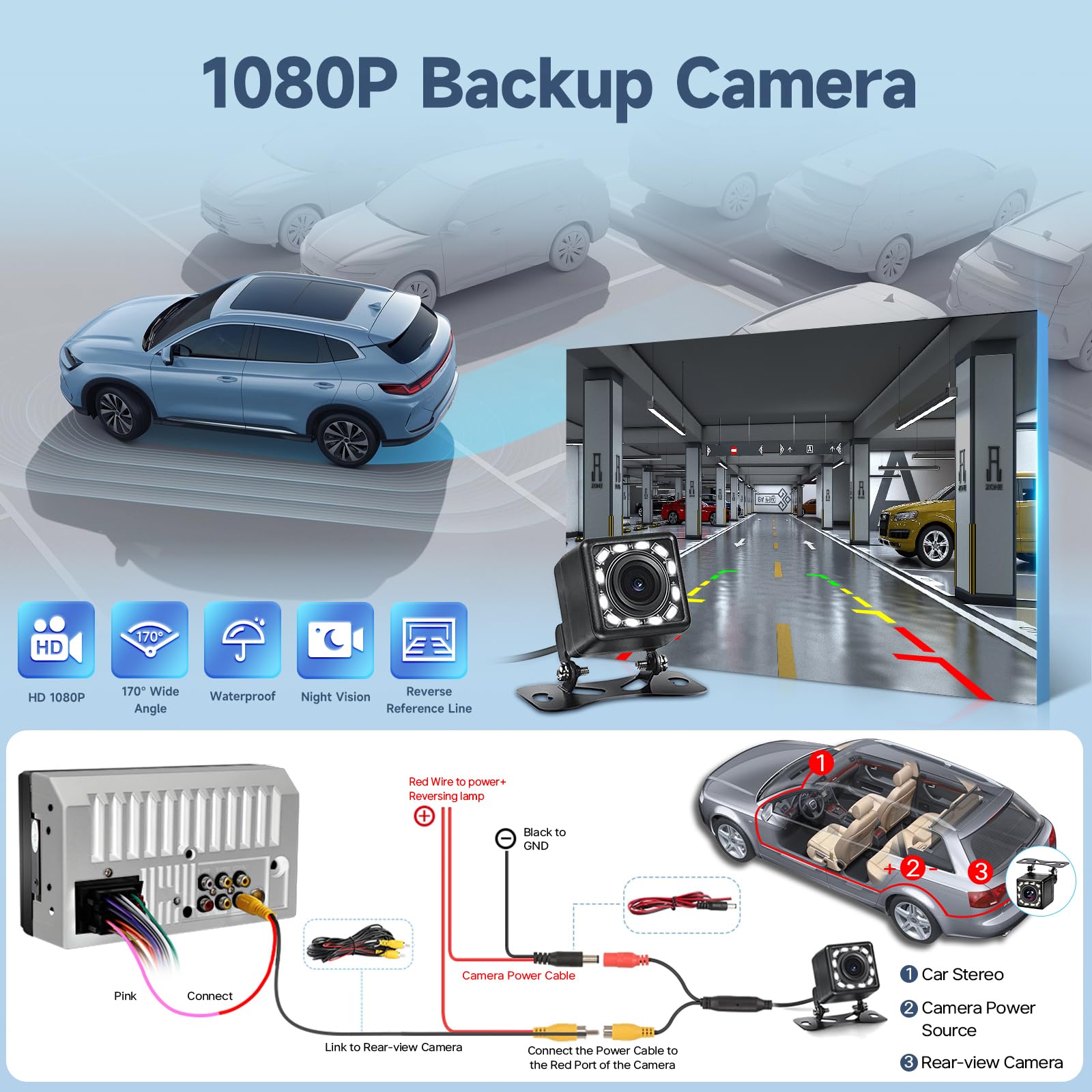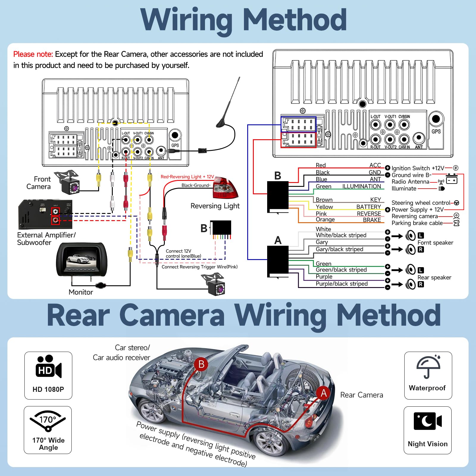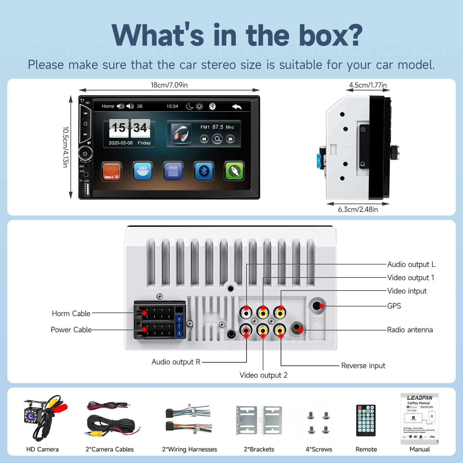 【Standard Double Din Stereo with Backup Camera】- Parking has never been easier with this premium double din car stereo which supports front and rear camera, for a safer and time-efficient experience! Simply shift into reverse and the system powers on the camera automatically, for optimal visibility no matter the weather conditions! If you encounter any operation or other problems, please contact us (click "Contact Seller" on your order page)