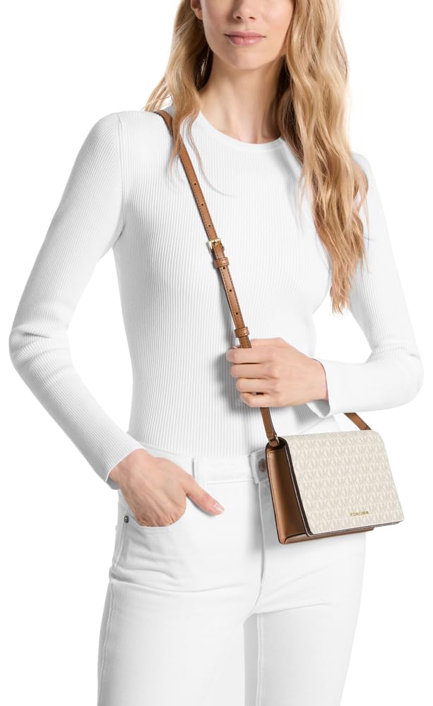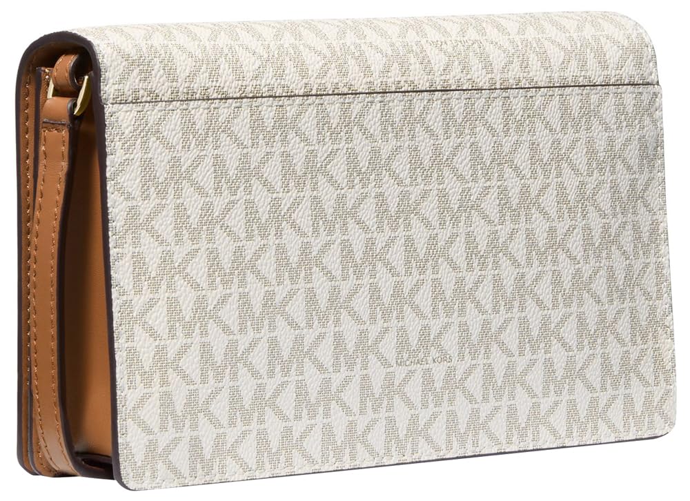 Materials: Crafted from our iconic Signature-print canvas with gold-tone hardware Attention to Details: Interior front zip pocket, 3 card slots, exterior back slip pocket, snap fastening and polyester lining. 8.5”W X 5.5"H X 1.75"D with adjustable crossbody strap