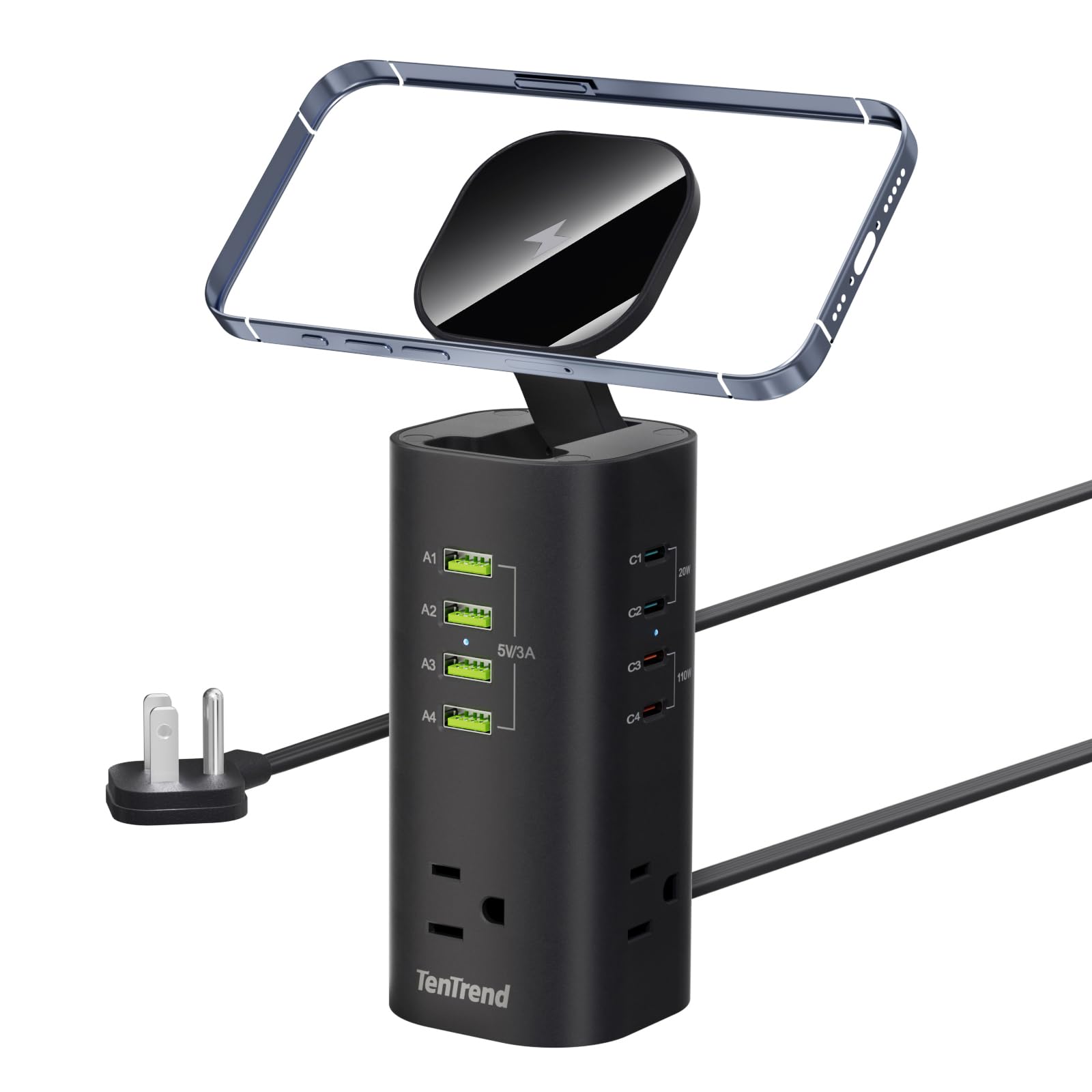 【12 in 1 Charging Tower】Featuring 3 AC sockets, 4 USB-C ports & 4 USB-A ports, 1 magnetic charging top. This power strip tower can charge up to 12 devices simultaneously.