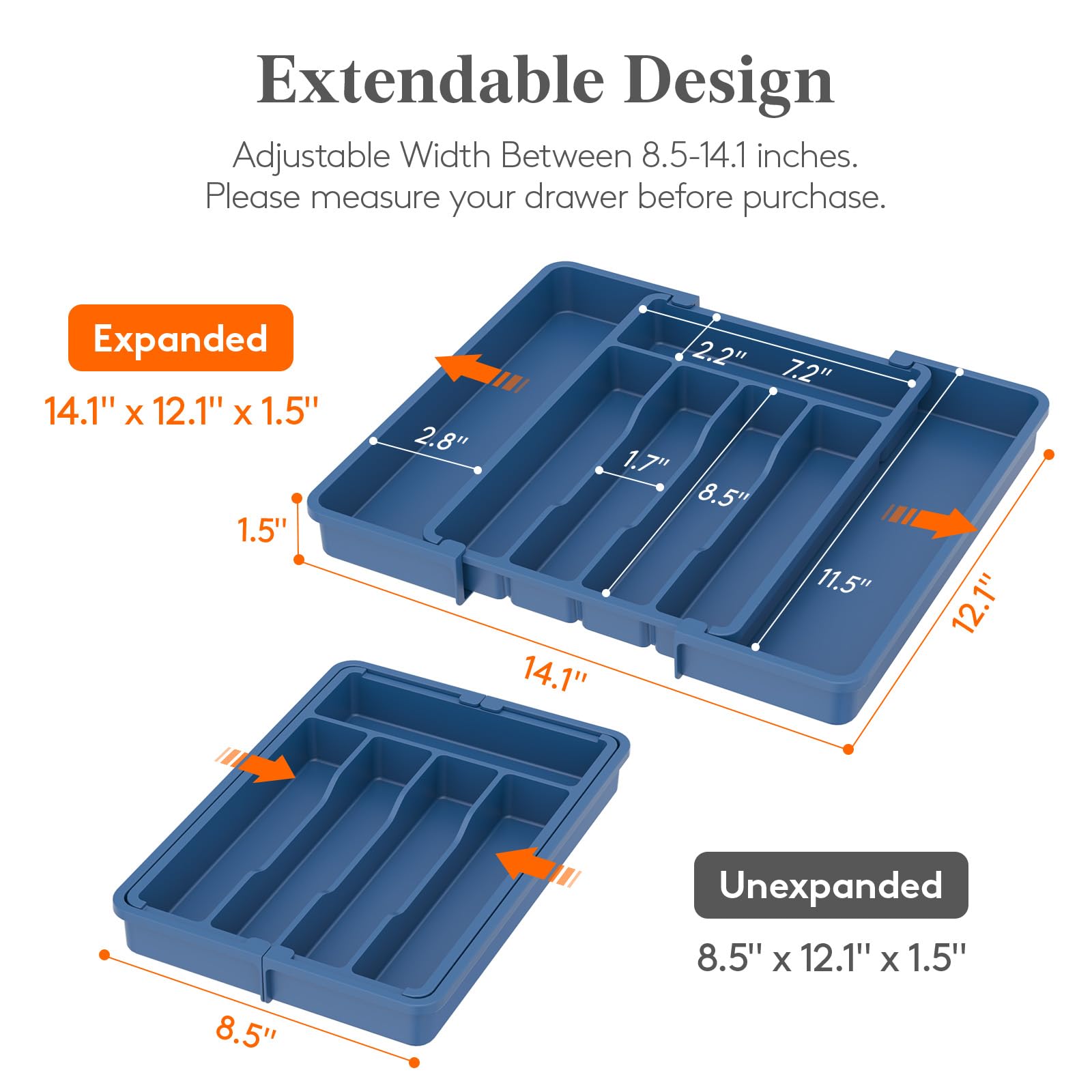 Adjustable Size: With an adjustable width between 8.5-14.1 inches, it is compatible with different drawer sizes. When fully expanded, the cutlery box dimensions are 14.1 x 12.1 x 1.5 inches and when fully folded, it reduces to 8.5 x 12.1 x 1.5 inches. So no matter what size your kitchen drawers are, this utensil organizer will surely fit in
