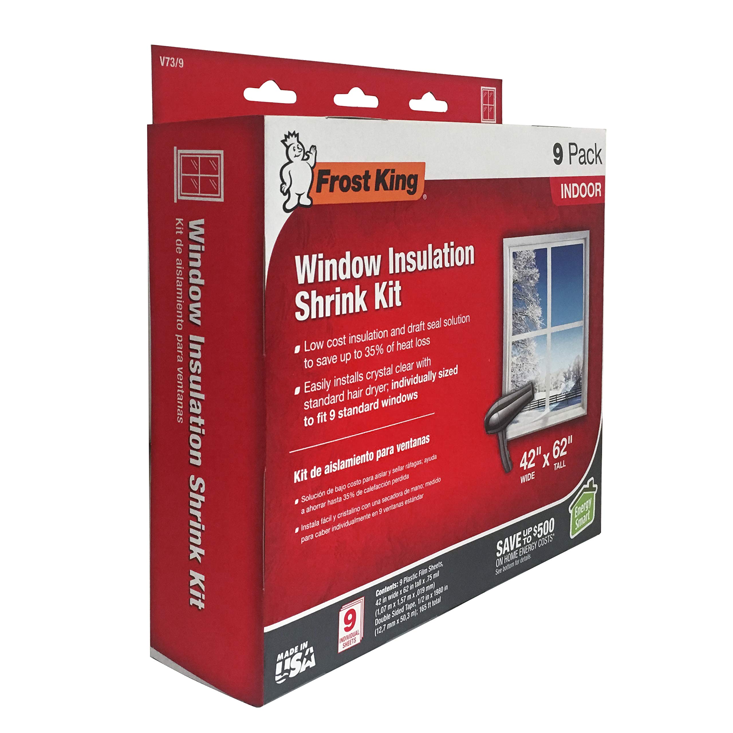 Product Description Frost King V73/9H Indoor Shrink Window Kit 42-Inch by 62-Inch, 9 sheets. Clear From the Manufacturer Frost King Shrink Window Kits are made for standard size windows and feature a crystal clear plastic sheet that shrinks tight and wrinkle free with any ordinary hand held hairdryer. Easily installs on metal, painted or varnished wood or vinyl clad frames with the double-face tape provided.. Manufacturer Contact Information 1-800-526-5265