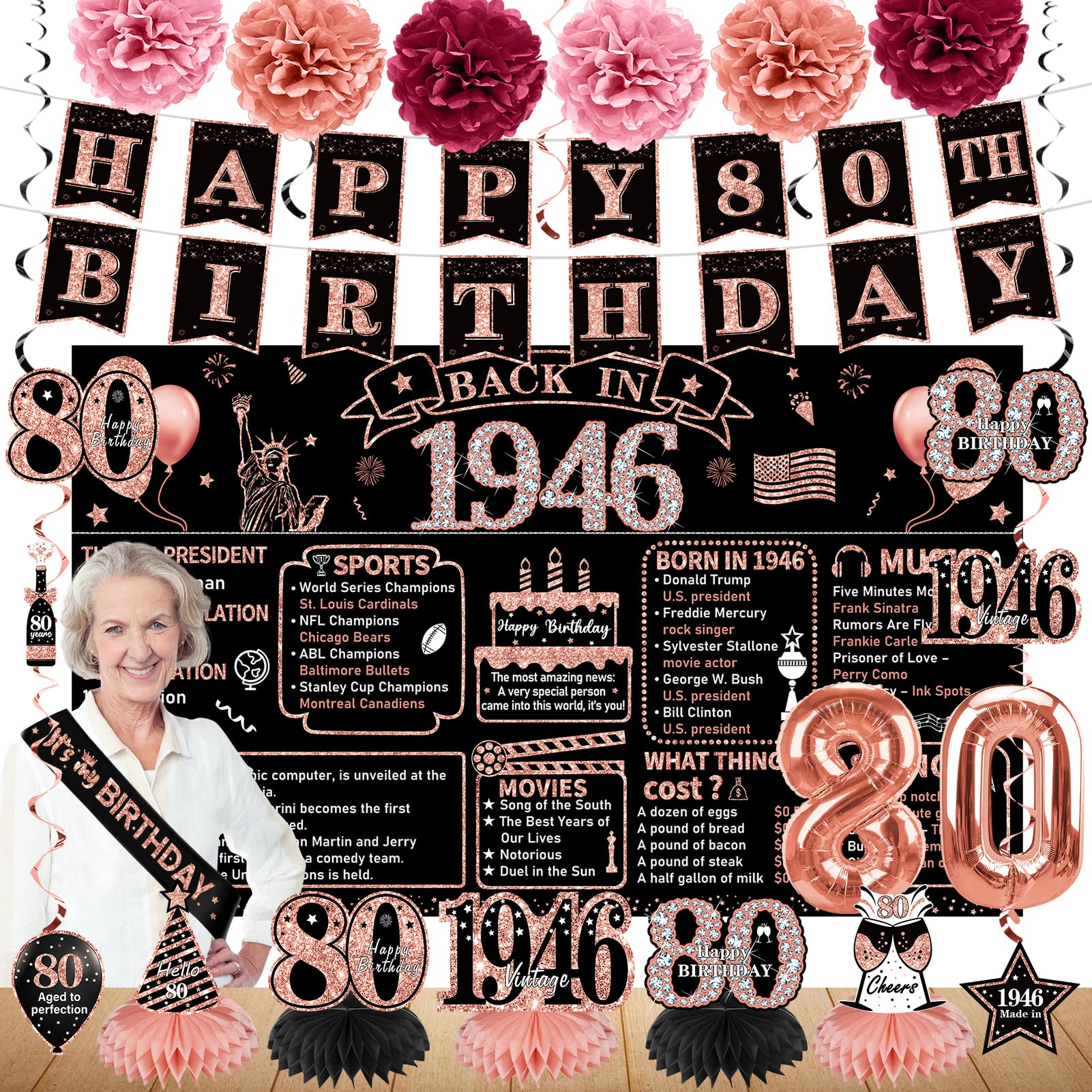 【Viintage 1945 Birthday Decorations for Women】: With elegant rose gold design,big font "Happy 80th Birthday", with black background, and adding cake, balloons, rose gold pink diamonds ,ribbons and other rich birthday elements,The design is very beautiful and novel,for your Add a rich ambience to the party and impress your family and friends.