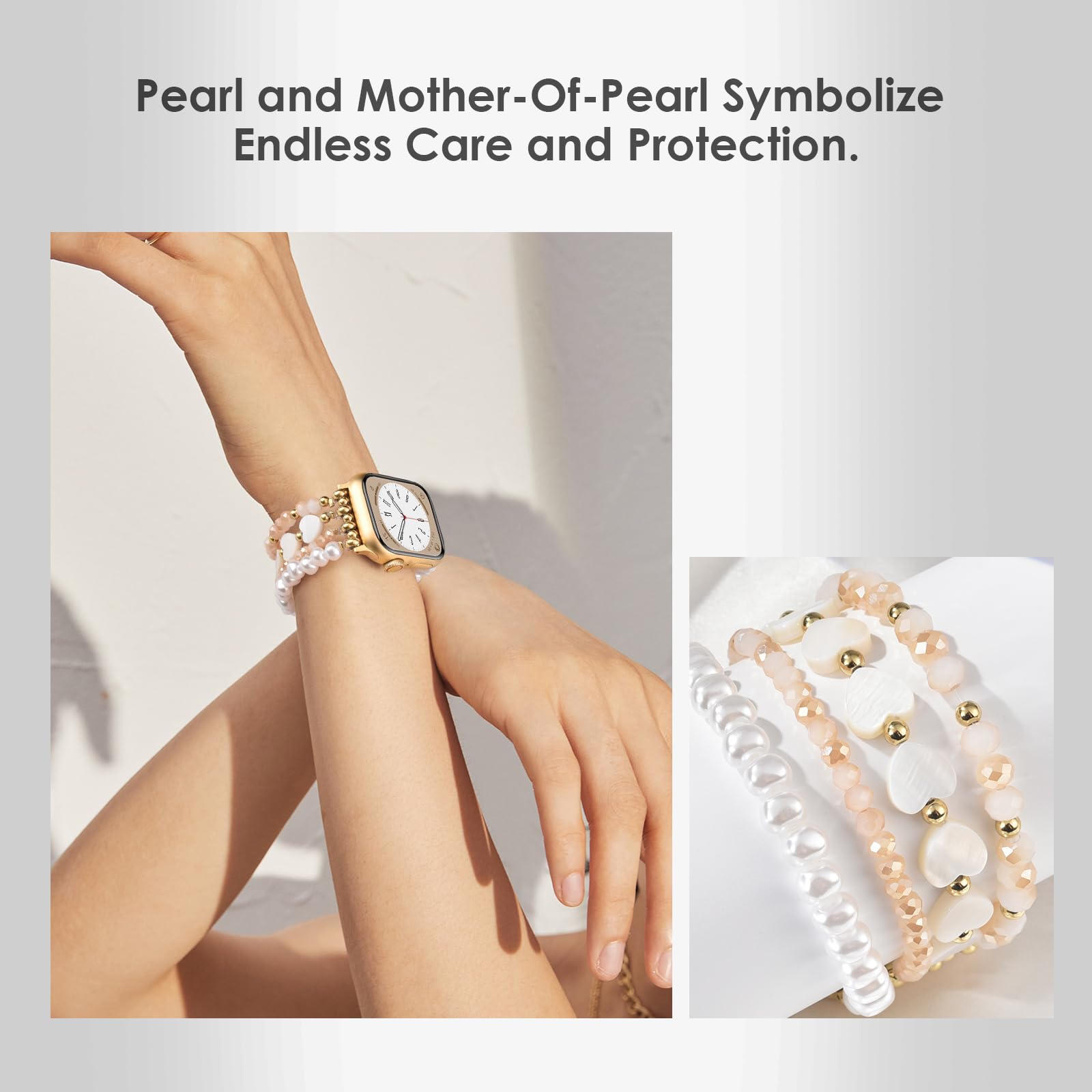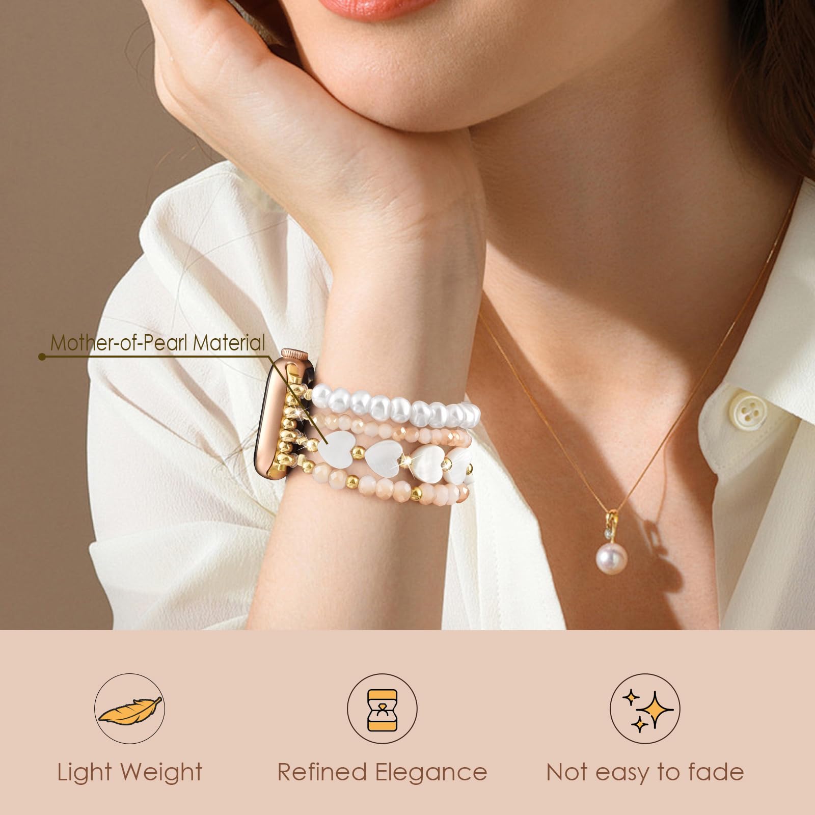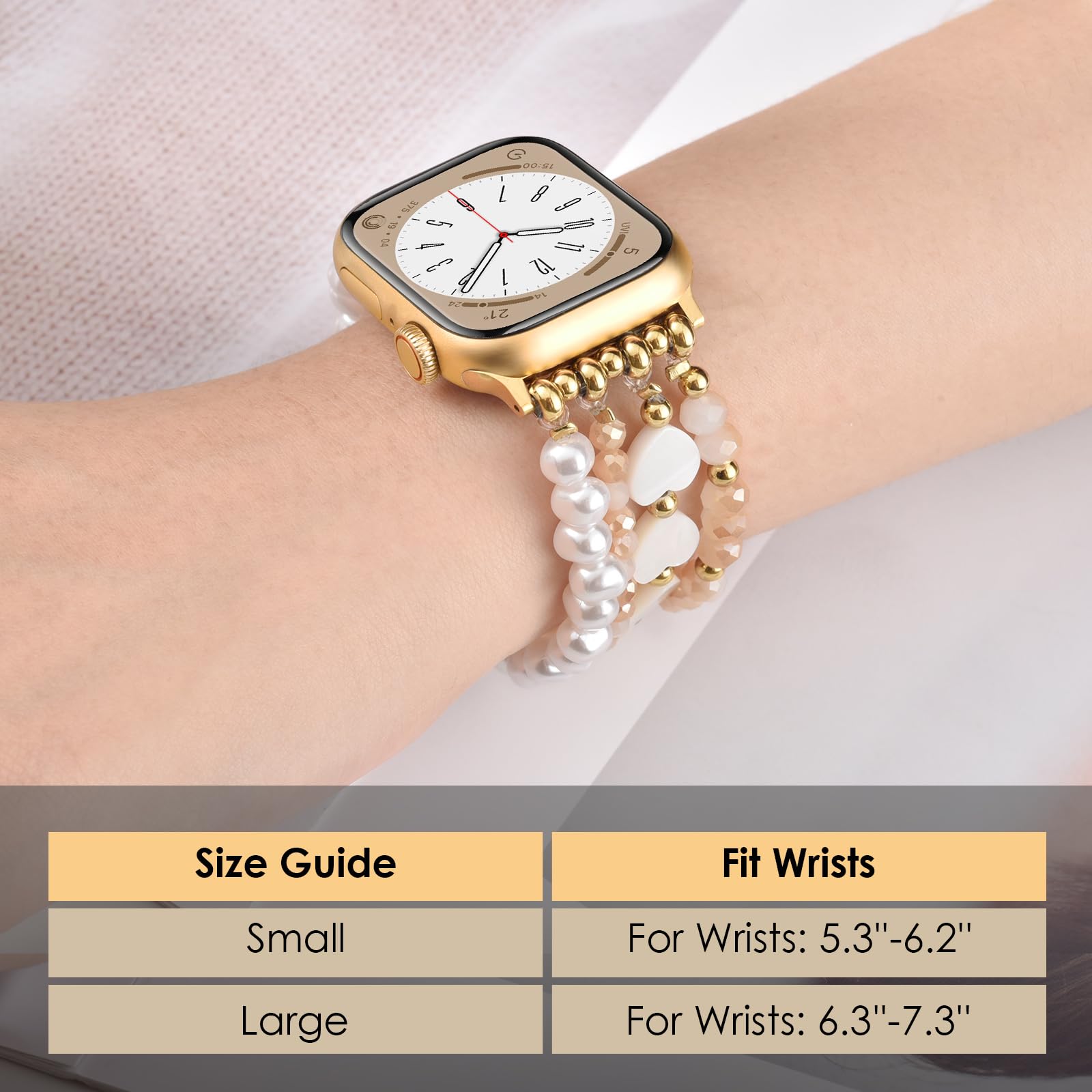 Perfect Fit: AIRSPO Apple watch bands for women have 2 size options: S: Fit for 5.3"-6.2" wrist; L: Fit for 6.3"-7.3" wrist. The bead bracelet is elastic, suitable for all kinds of wristwear, and suitable for all ages making you elegant and charming every moment.