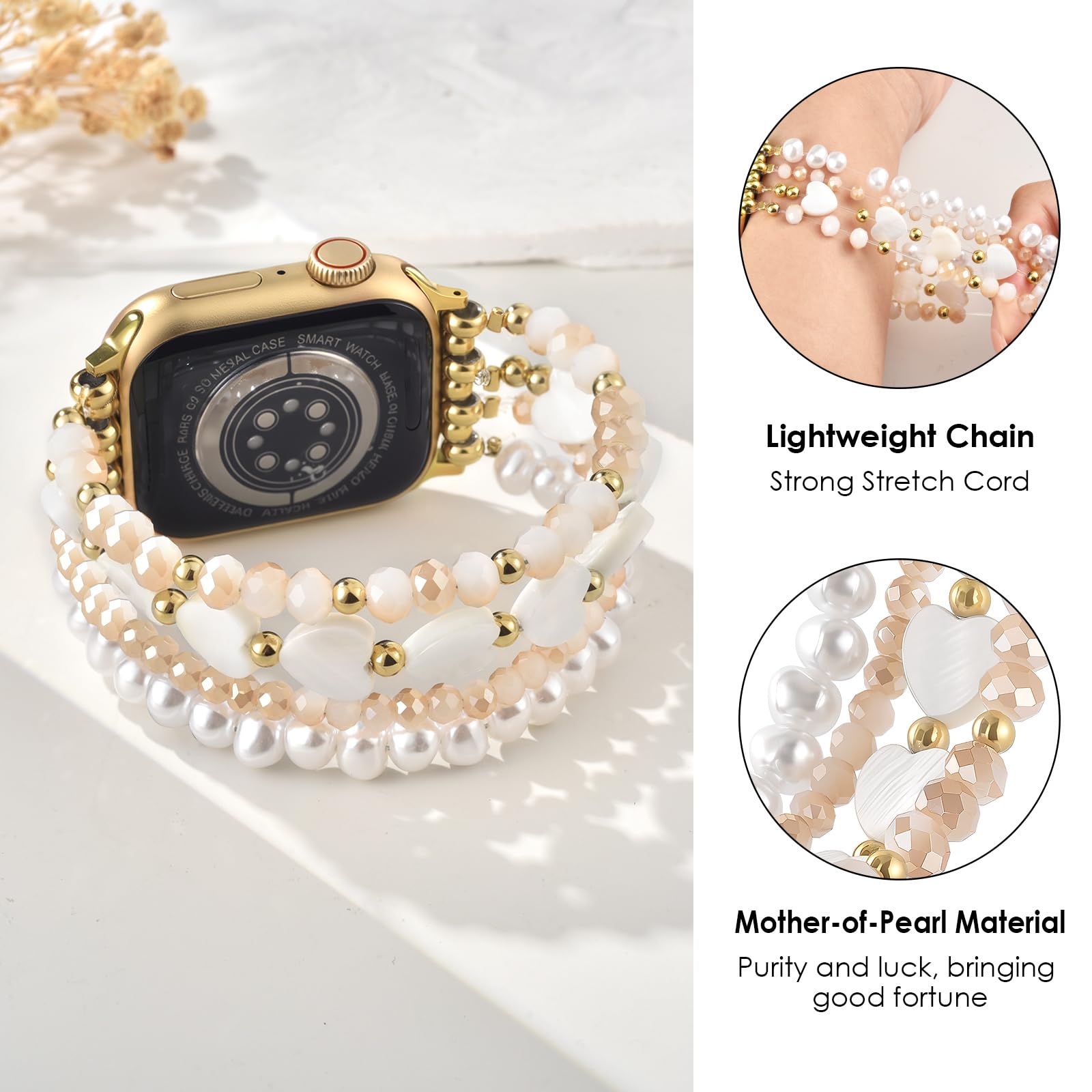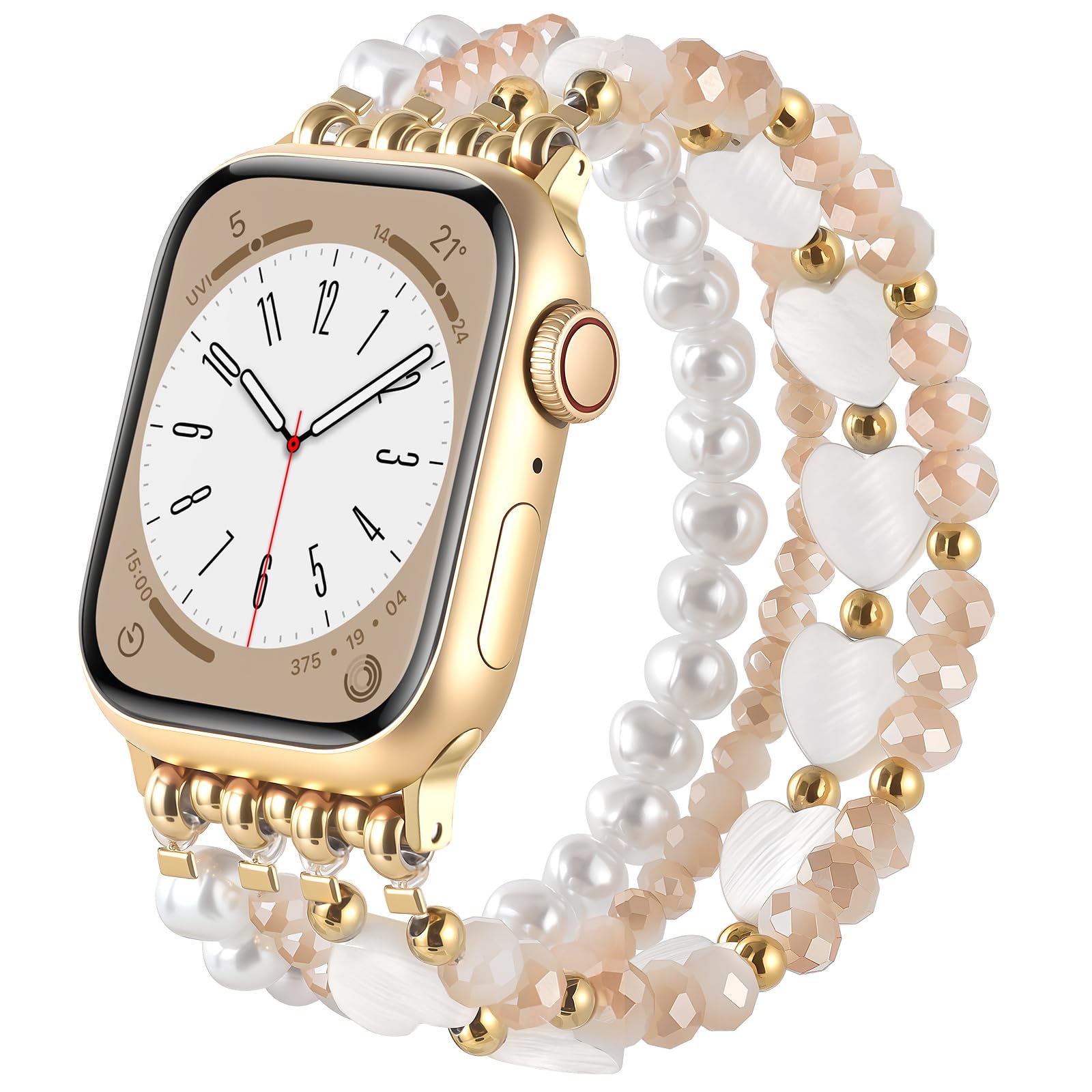 Description AIRSPO Gold Beaded Bracelets Compatible for Apple Watch Band 38mm 40mm 41mm 42mm 44mm 45mm Women, Fashion Handmade Dressy iPhone Watch Bands Elastic Strap for iWatch Series 11 10 9 SE 8 7 6 5 4 3 2 1