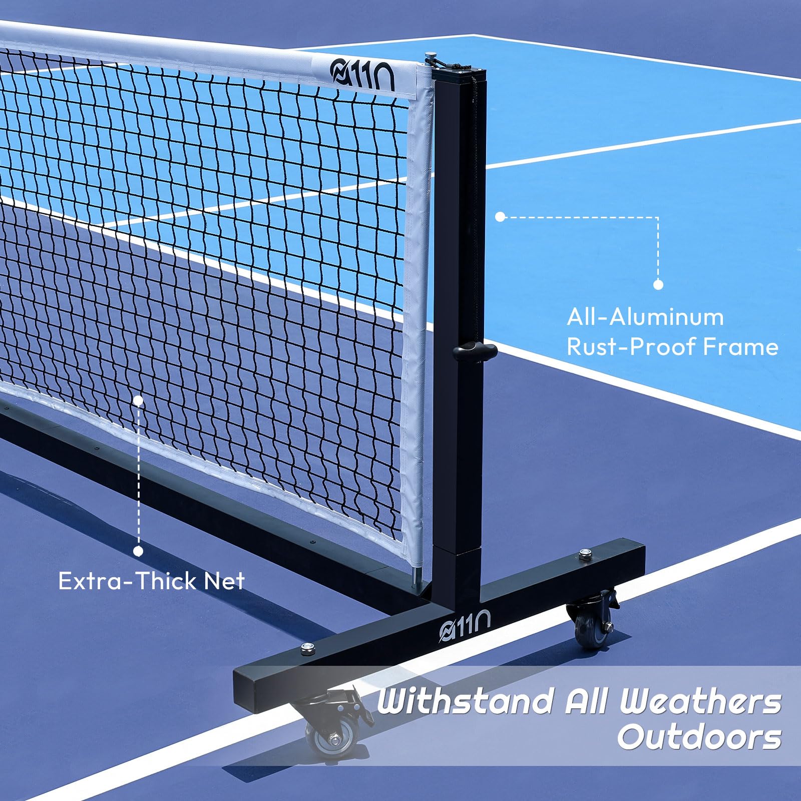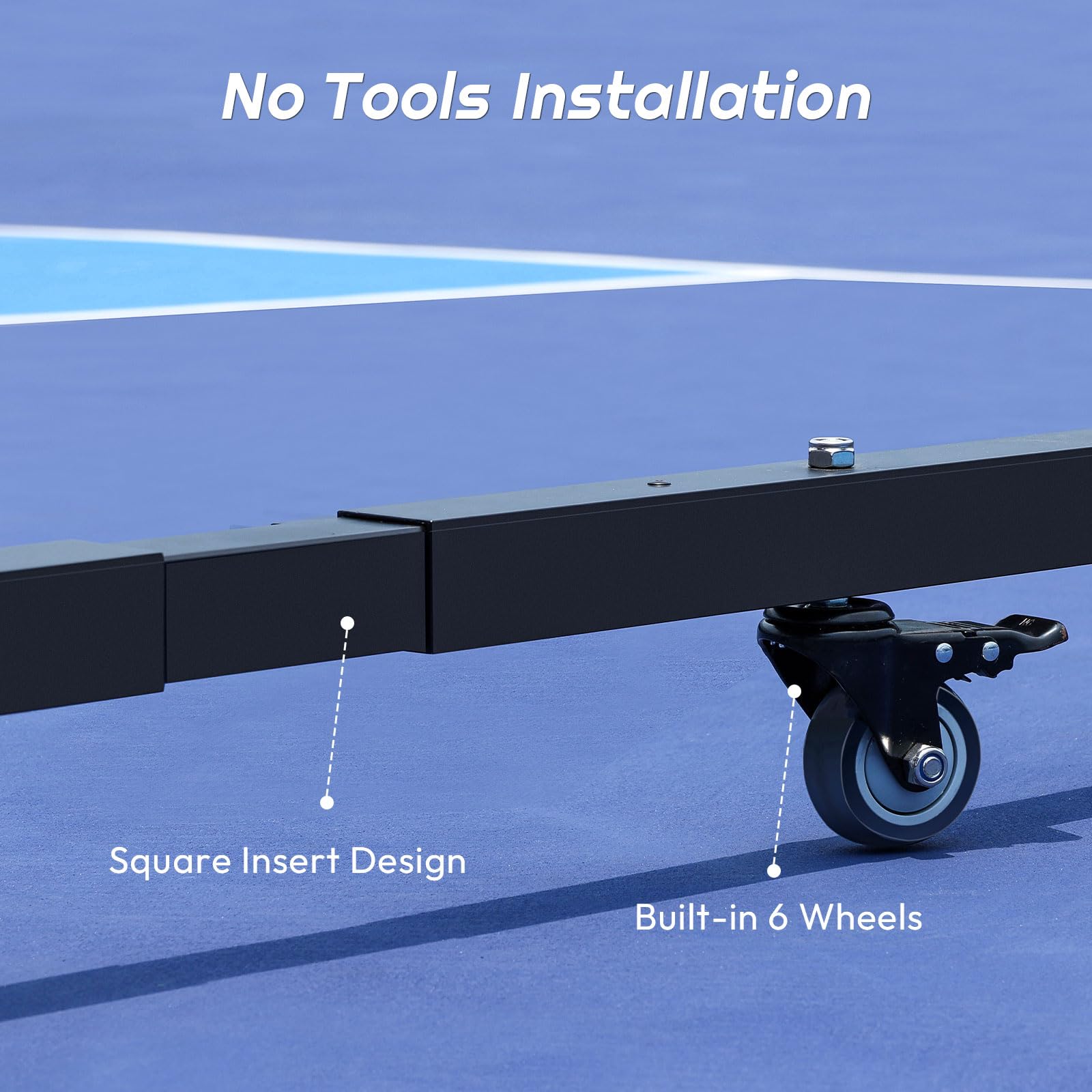 Screwless Assembly: The innovative screwless design simplifies the installation process, making this pickleball net portable and easy to set up and take down, saving time and effort. Meanwhile, equipped with 6 built-in caster wheels, this net glides effortlessly across outdoor courts or wooden gym floors.