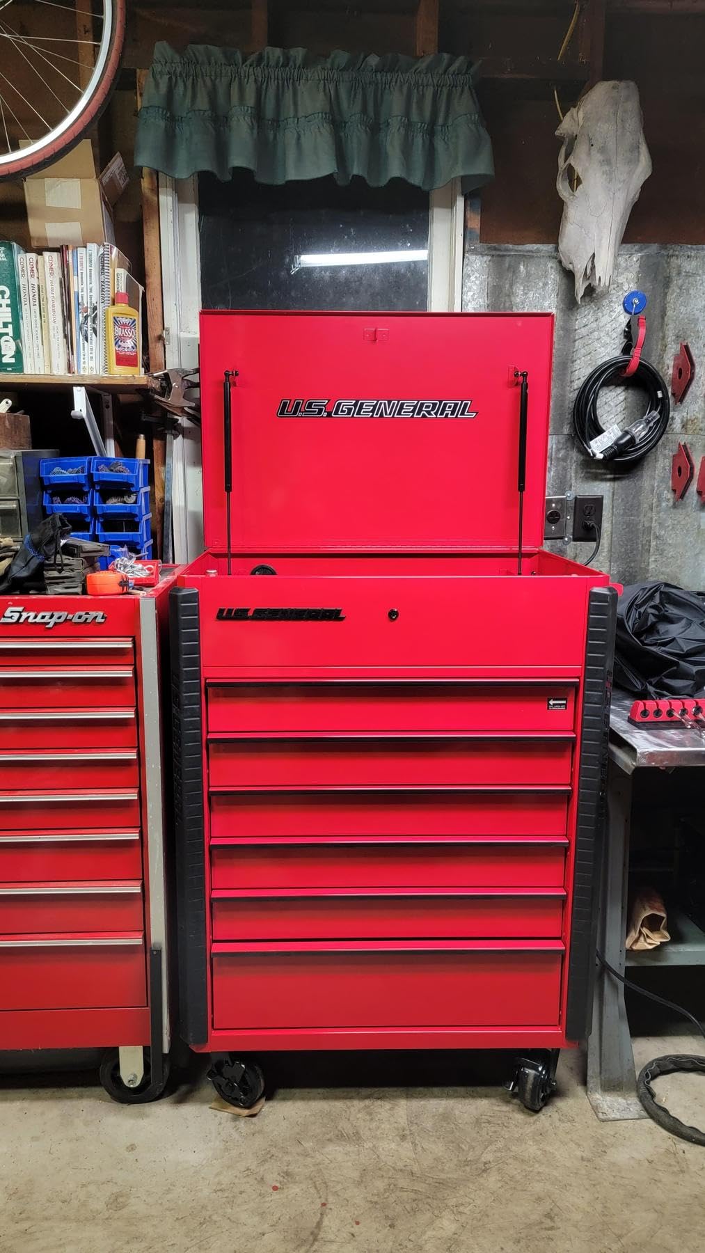 Get up to 18,700 cu. in. of accessible tool storage with this compact, heavy duty full bank cart. This 34 inch full bank service cart has top quality features like ball-bearing drawer slides, rolled drawer edges, and glossy powder coat paint. This full bank cart features 6 drawers with a variety of heights to accommodate large and small tools and lift gate top storage. With heavy-duty 5 in. swivel casters, this unit can hold 1200 lb. of tools securely. The powder coat finish is durable, and easy to clean.