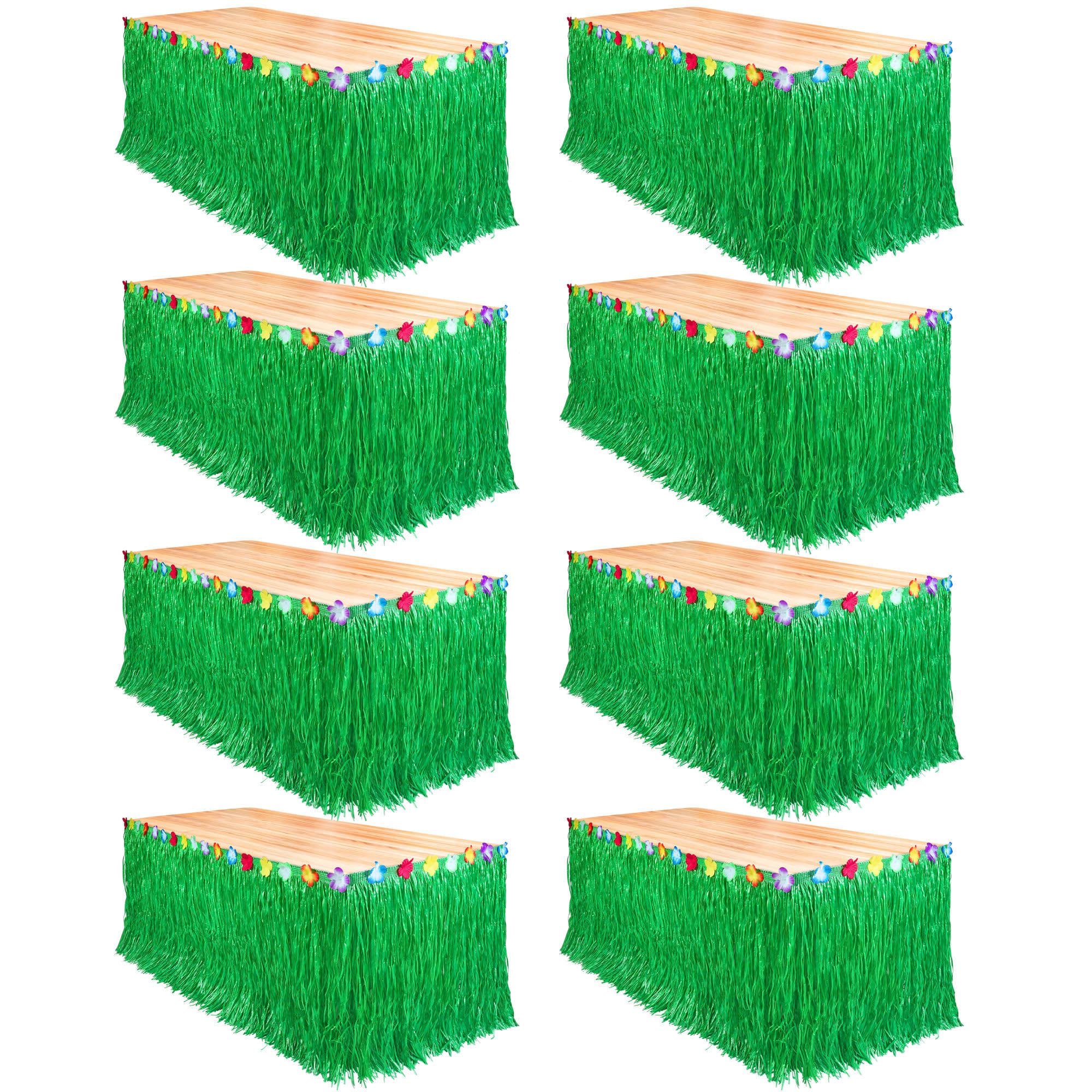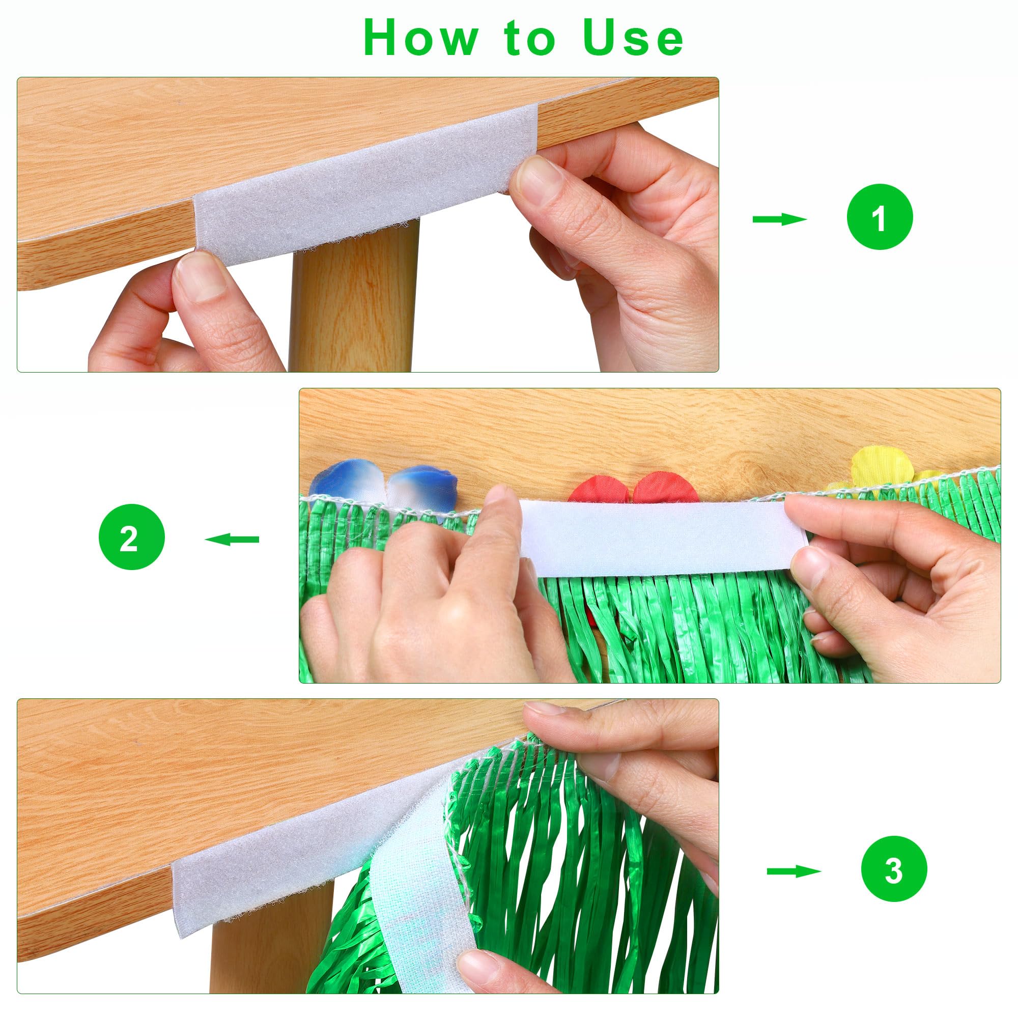What you will receive: the package comes with 8 packs of green grass table skirts in each set, and each Hawaiian themed grass table skirt natural is also paired with 5 pairs of adhesive hoop and loop tapes, convenient and practical for your holiday decorations
