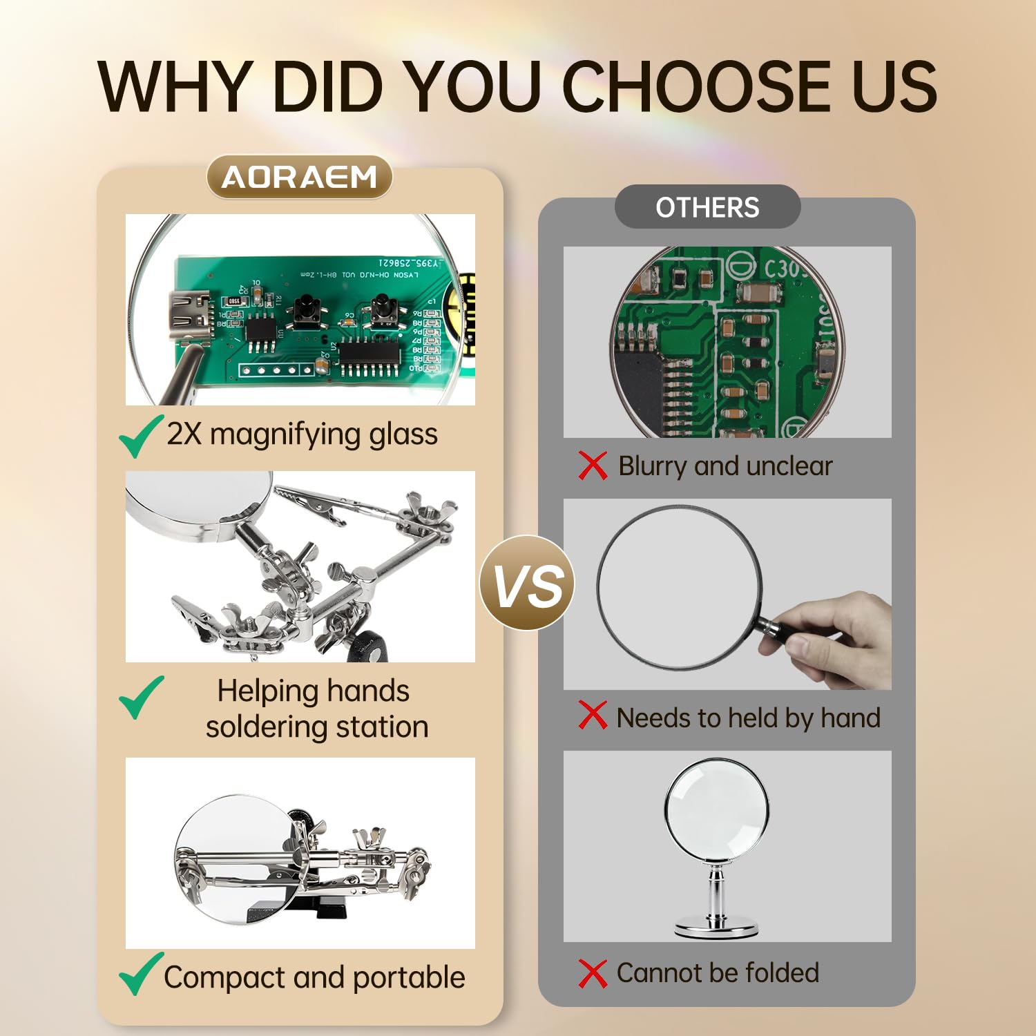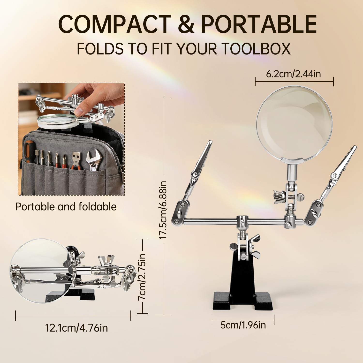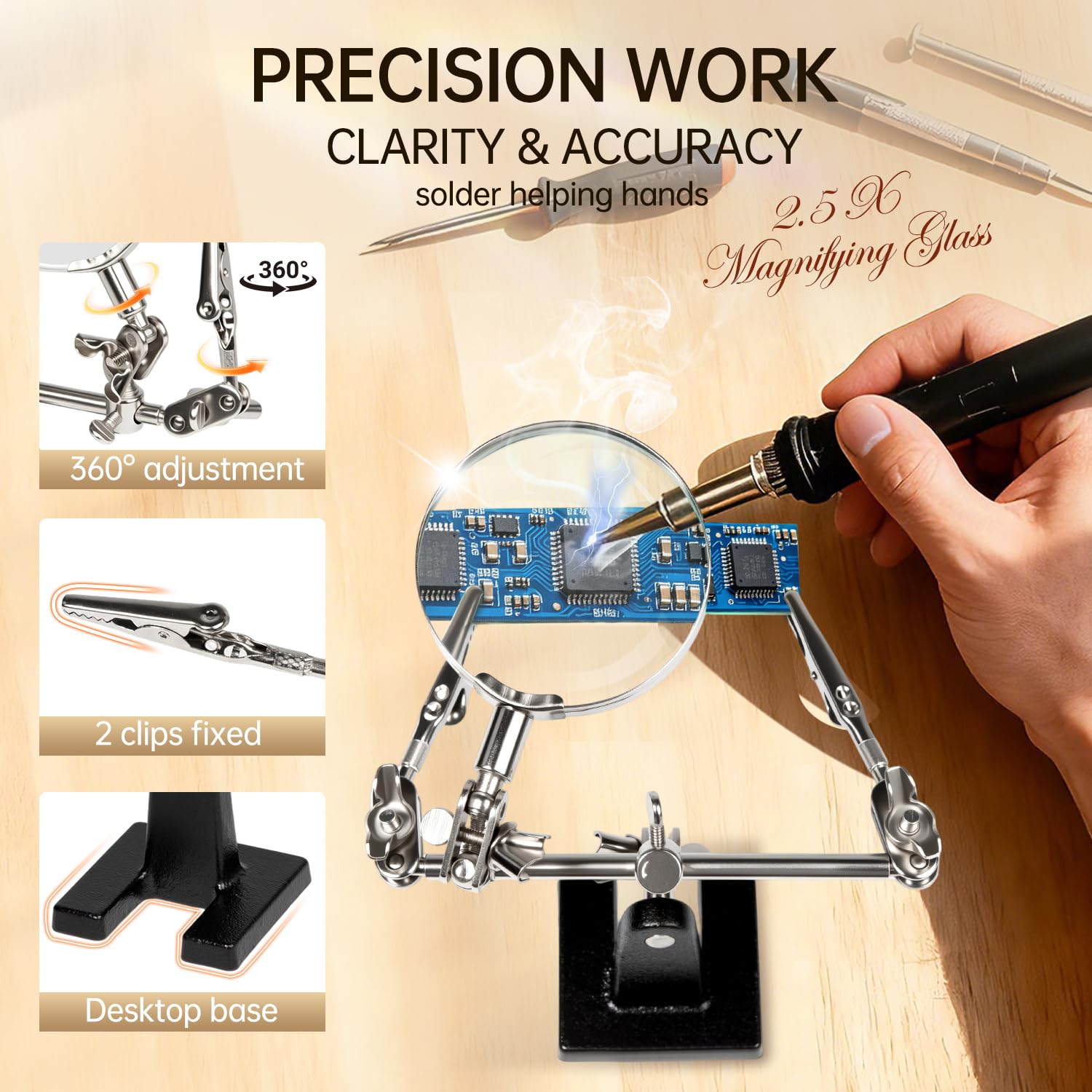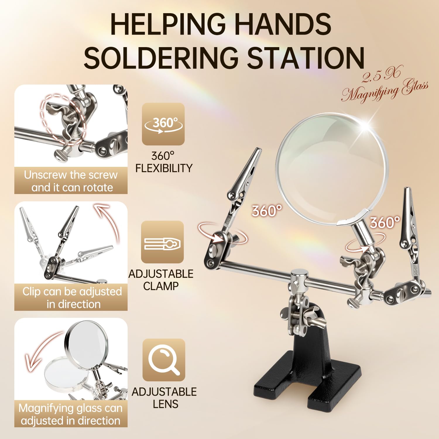 Magnifier Station Stand Tool --AORAEM Helping Hand Station are include with 2.5x Glass lens,2 alligator clips on 4-way swivels and adjustable magnifier and clips in various angles and heavyweight base.you will be able to make adjustments with ease as it can accommodate medium to small sized items.