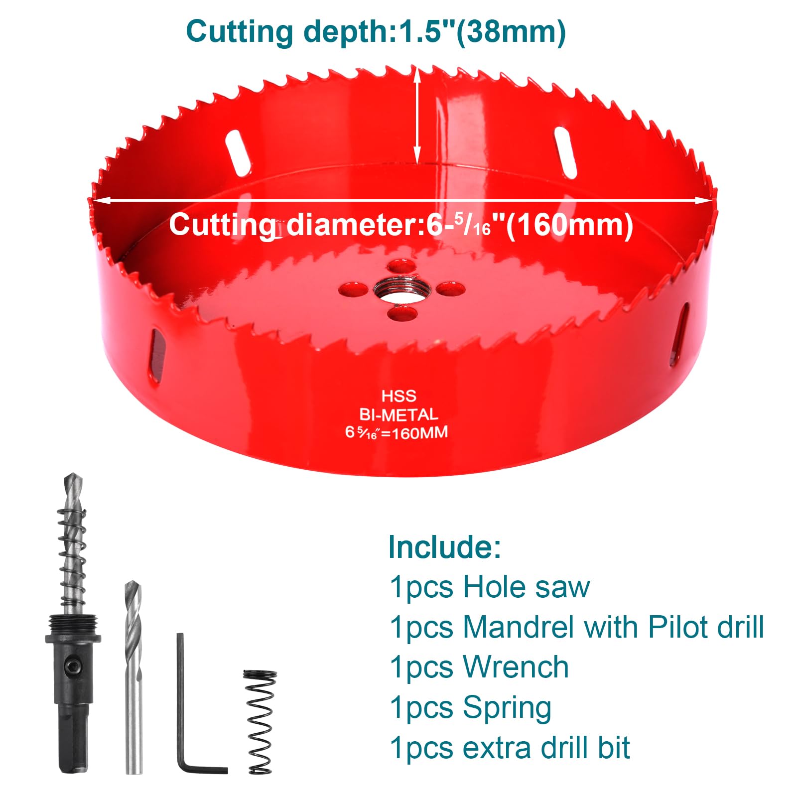 HOLE SAW: Our high-speed steel sharp cutting teeth effectively drill through metal, wood, cornhole boards, PVC board, plastic, drywall, and more. The hole saw set includes 1* 6-5/16'' hole saw, 1*arbor(with 1 drill bit), 1*drill bit for replacement, and 1*hex key. Cutting diameter is 6-5/16" / 160mm, opening depth is 1.5" / 38mm.