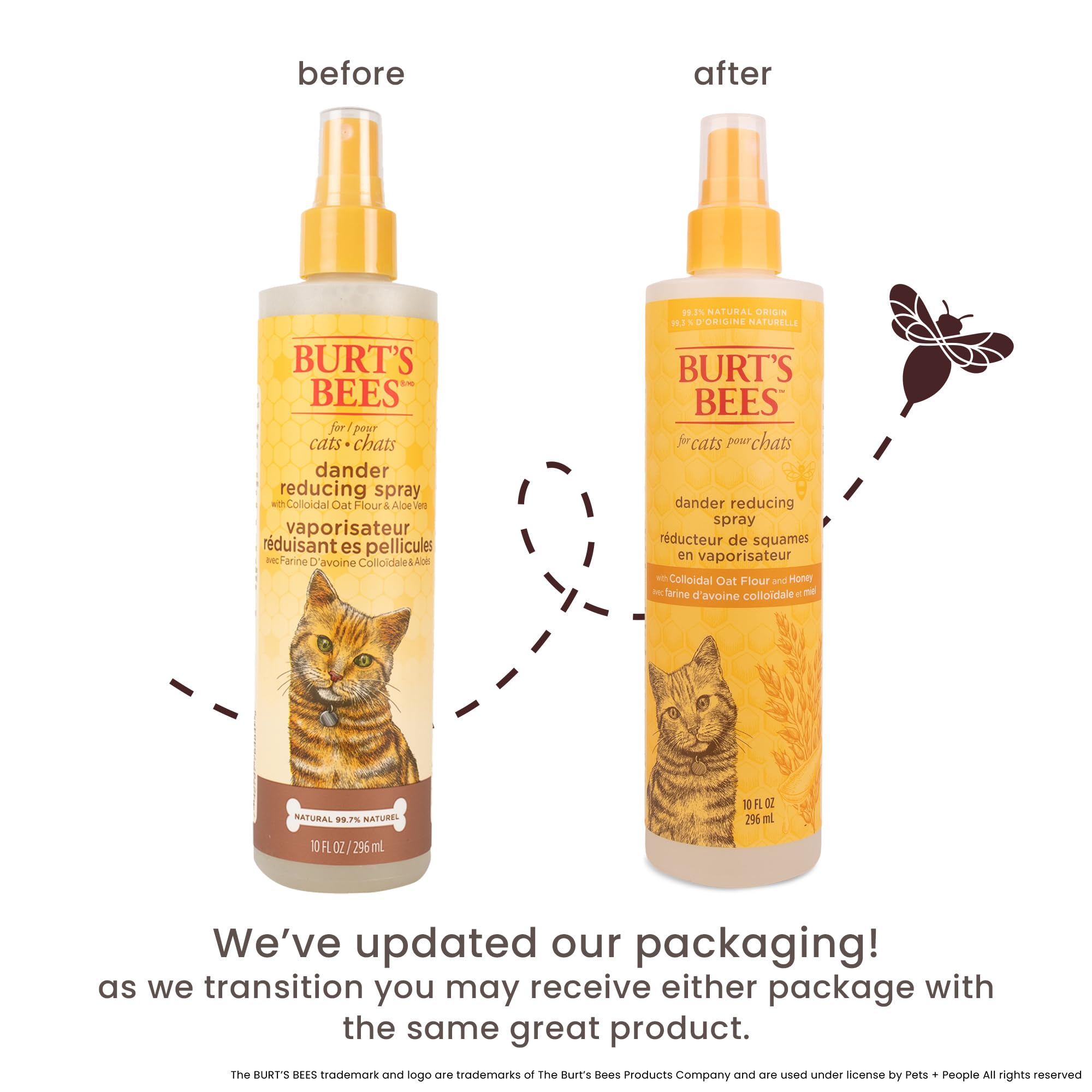 "Since 1984, Burt’s Bees has been working with nature to create products that nourish your skin. With the same mission in mind, we created a custom formulated range of cat grooming products to bring the same quality to the lives of our pets. Burt’s Bees™ for Pets™ Cat Dander Spray with colloidal oat flour leaves your pet clean while it nourishes and moisturizes their skin and coat. Leveraging the power of naturally derived ingredients, colloidal oat flour helps control excess dander and deter dander. All our cat grooming products utilize at least 95%+ natural origin formulas and are formulated without chemical detergents, phthalates, parabens, or sulfates. Our cat grooming products are also formulated without added colorants and dyes. Burt’s Bees naturally derived pet grooming solutions keep pets clean and pet parents happy! Our gentle cat spray for dander is cruelty-free and made in the USA with global ingredients. We choose to formulate without harsh chemicals, while ensuring 95%+ natural origin formulas, pH balanced to effectively cleanse and nourish your pet. Directions: SPray cat from back of ears to tail, avoiding eyes. For best results, distribute formula with a dry towel. Store in a cool, dry place. *Nielsen Total Pet Plus Stores Pet Grooming Shampoo/Conditioner L52 W/E 10-11-25"