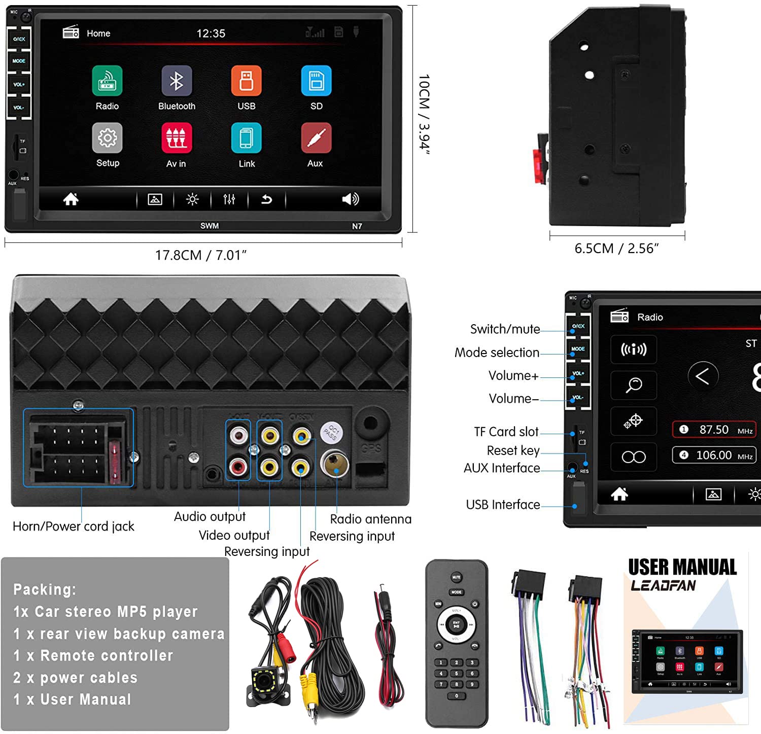If you encounter any operation or other problems, please contact our customer service(find us from the ‘contact the seller’ function in your purchase history). Our stereo comes with a 1-year warranty and provides professional technical support.Packing List: 1x Car MP5 Player, 1x User Manual, 2x Wire Harness,1x Remote Control,1x Backup Camera