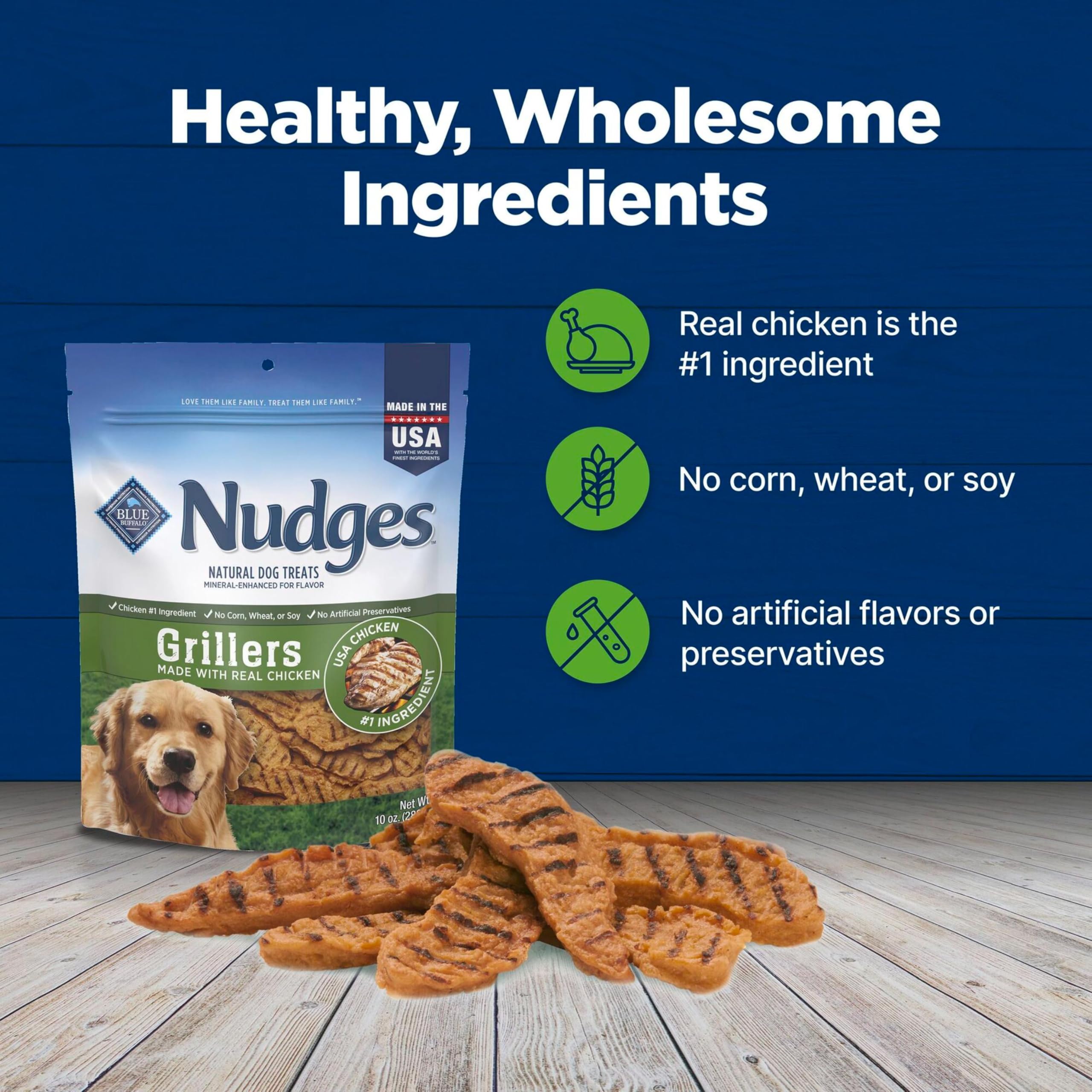 Give your dog the taste of real chicken with BLUE Nudges Grillers Natural Dog Treats. Made with real USA chicken as the first ingredient, these treats for dogs have a tender texture and are easy to tear into smaller pieces. They're great for dogs of all breed sizes and ages. And like all Blue Buffalo dog treats, these treats for dogs never contain chicken (or poultry) by-product meals, corn, wheat, soy, artificial flavors, or preservatives. Watch their tail wag when you reward them with BLUE Nudges Grillers Chicken Dog Treats.