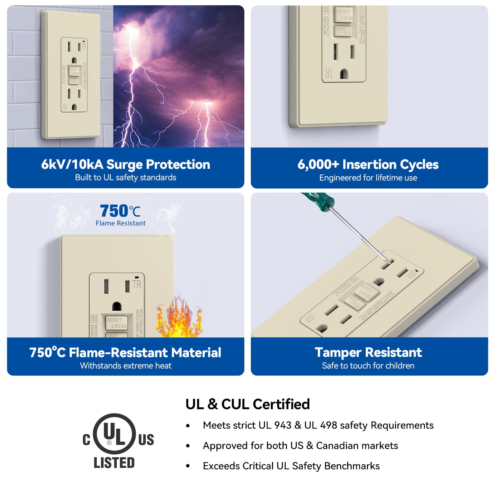 ✅【Durable and Ultra-Safe Design】Built with premium high-impact resistant thermoplastic materials. Endurance-tested over 6,000 times—twice the UL requirement. Features advanced safety features like 6kV surge protection, Reset-Disable, and Reversed Wiring Prevention to ensure long-lasting performance and maximum protection.