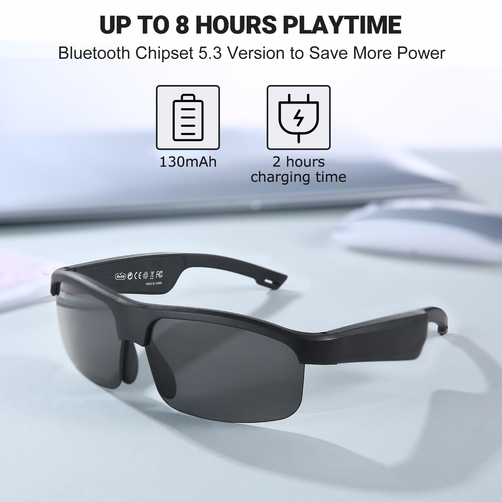 Ultra-high Quality Battery: Considering the user's long term experience, LVTEL Smart Glasses are powered by a high quality battery, which takes only 2 hours to fully charge and can be used for up to 8 hours of continuous playback, which is both durable and safe.